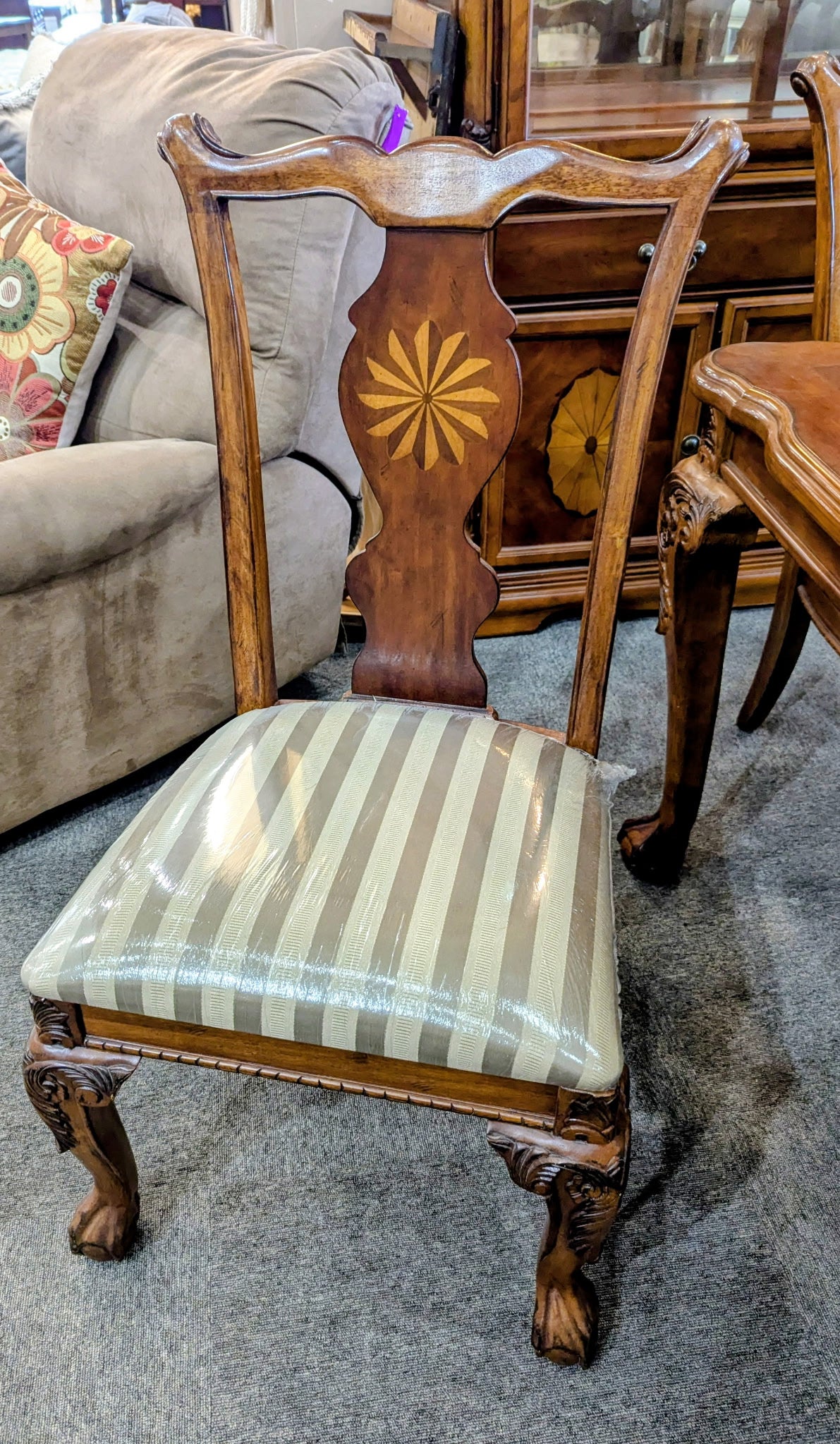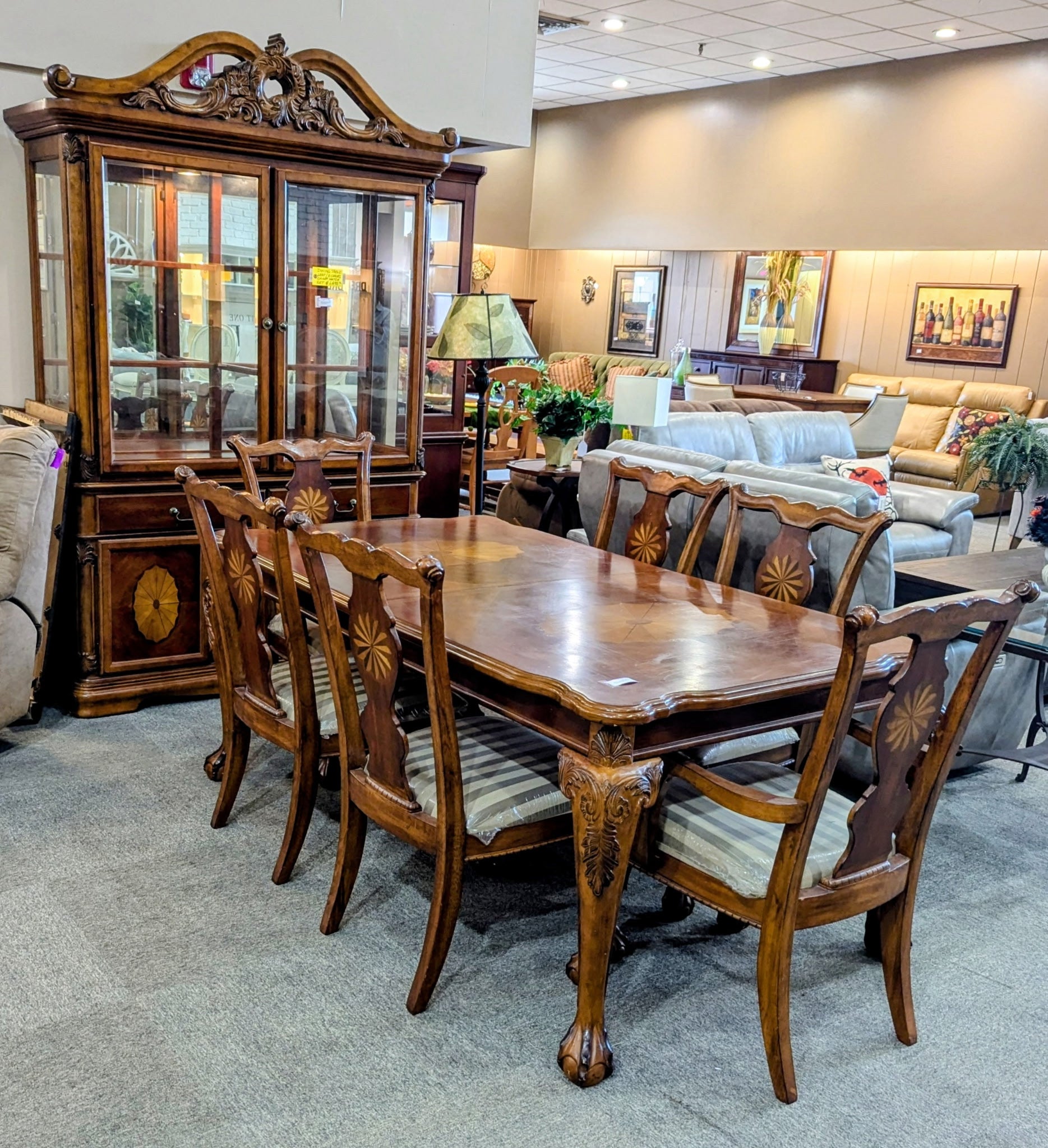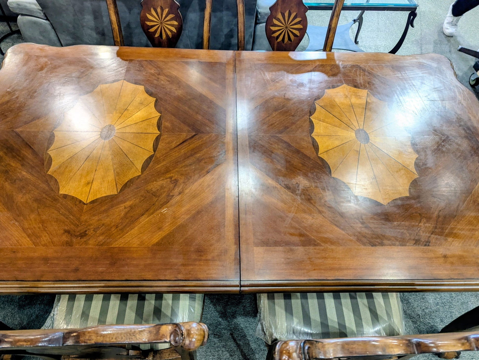 SET INLAY DINING TABLE WITH ONE LEAF, & EIGHT CHAIRS, AND TWO-PIECE CHINA HUTCH