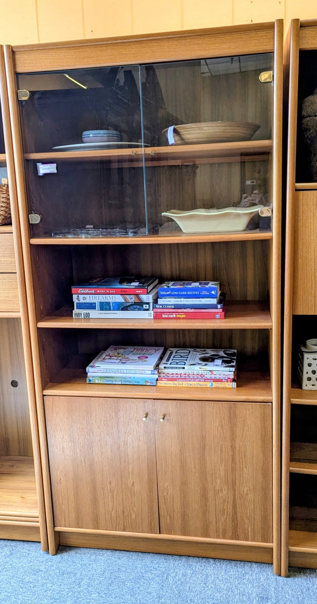 TEAK BOOKCASE WITH UPPER GLASS DOORS AND LOWER DOORS