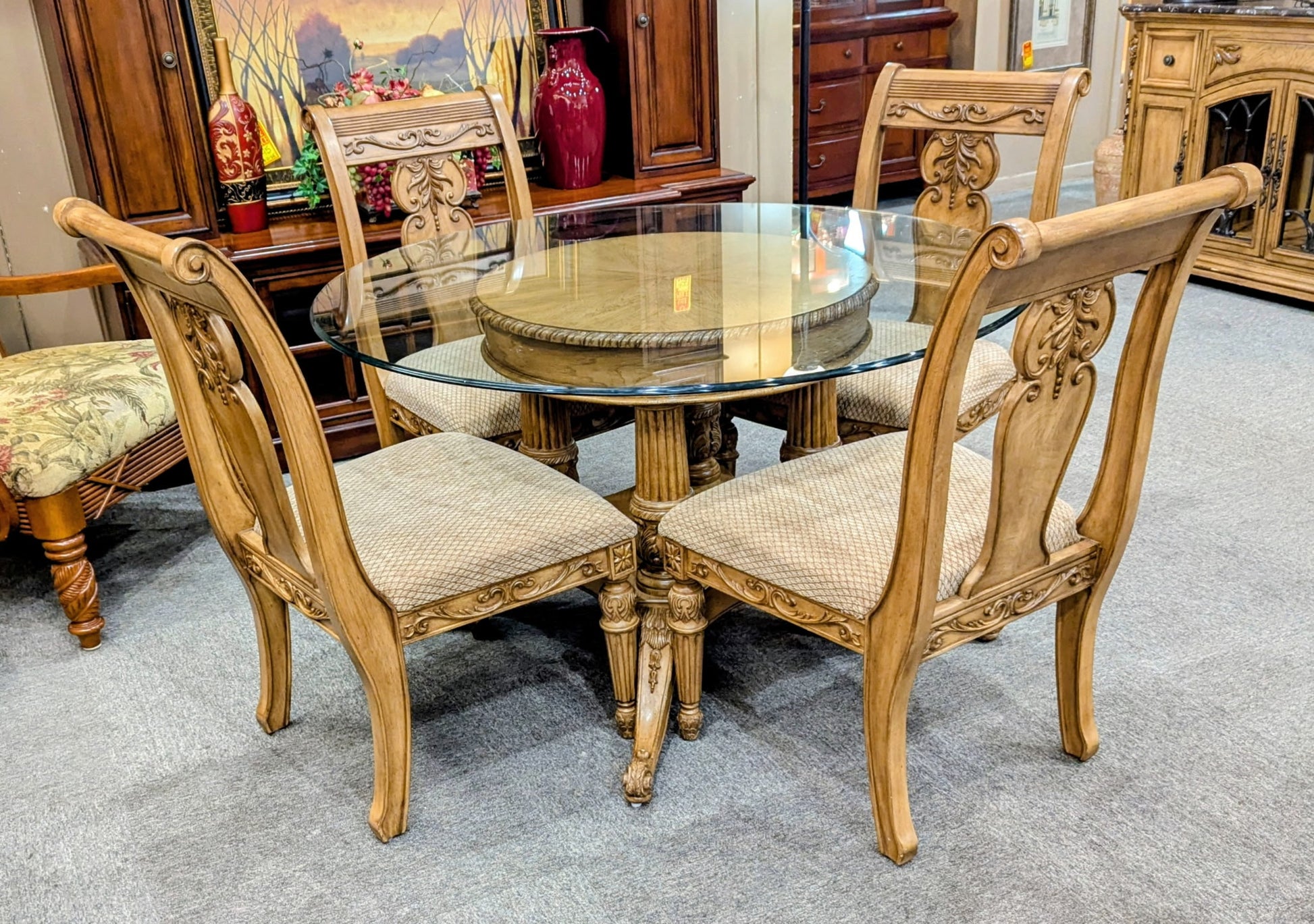 WOOD BASE DINING TABLE WITH GLASS TOP AND FOUR CHAIRS.