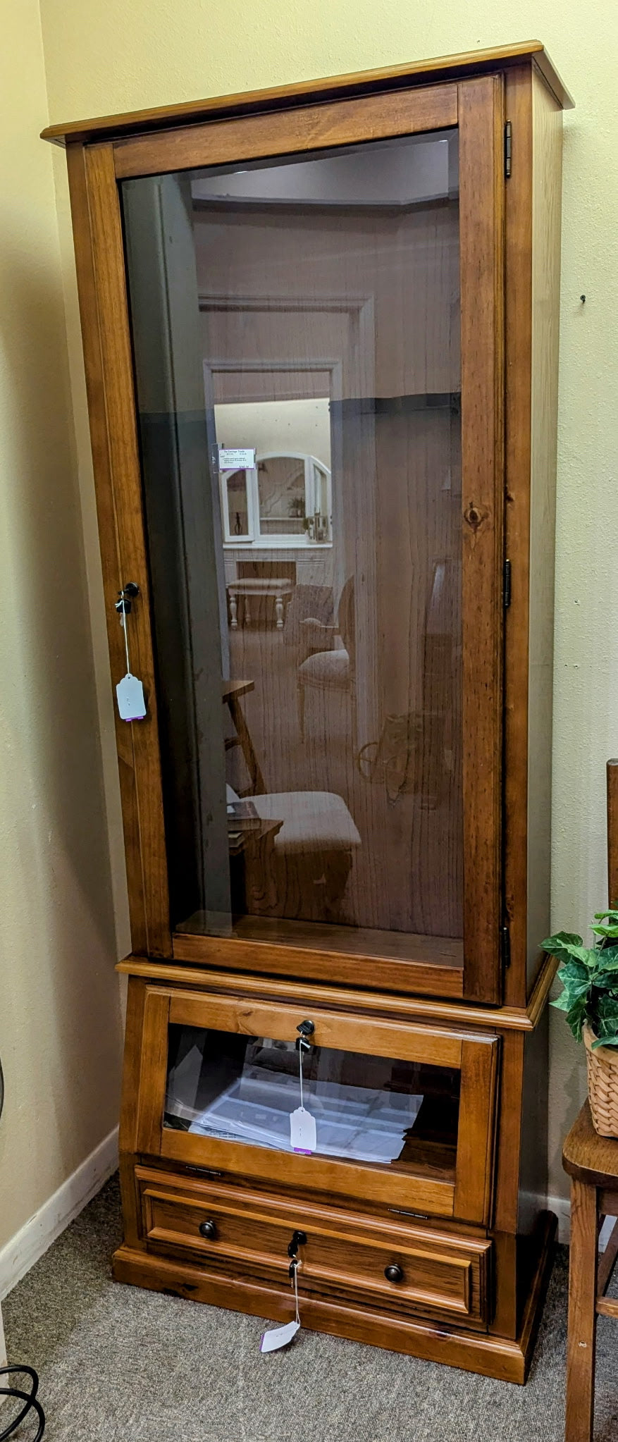 WOOD GUN CABINET WITH GLASS DOORS AND DRAWER WITH THREE SETS OF KEYS.