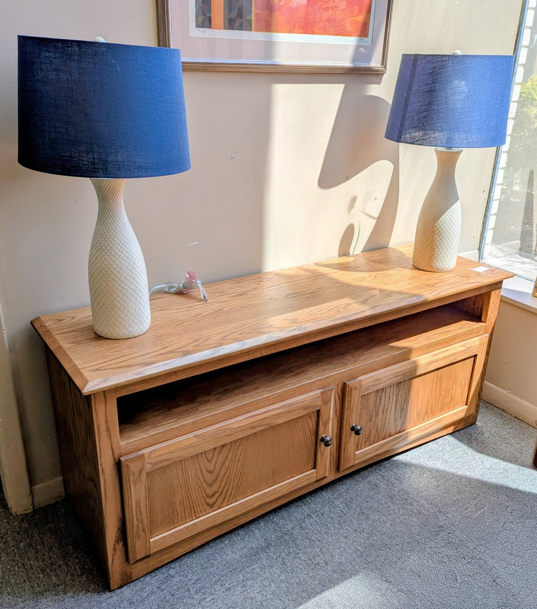 SOLID OAK TV CONSOLE WITH TWO DOORS AND OPEN CUBBY