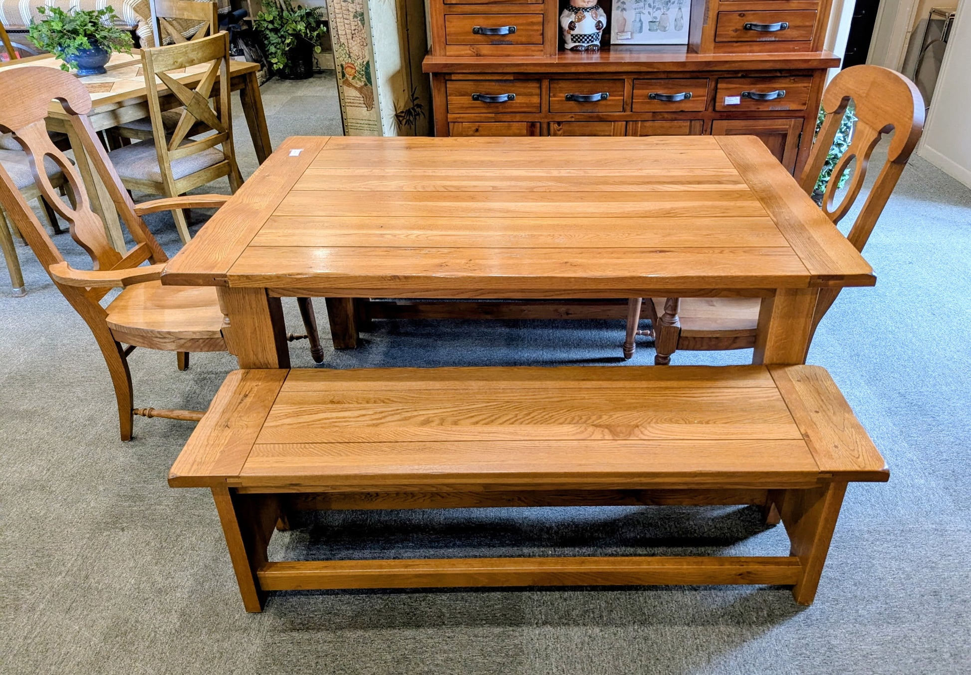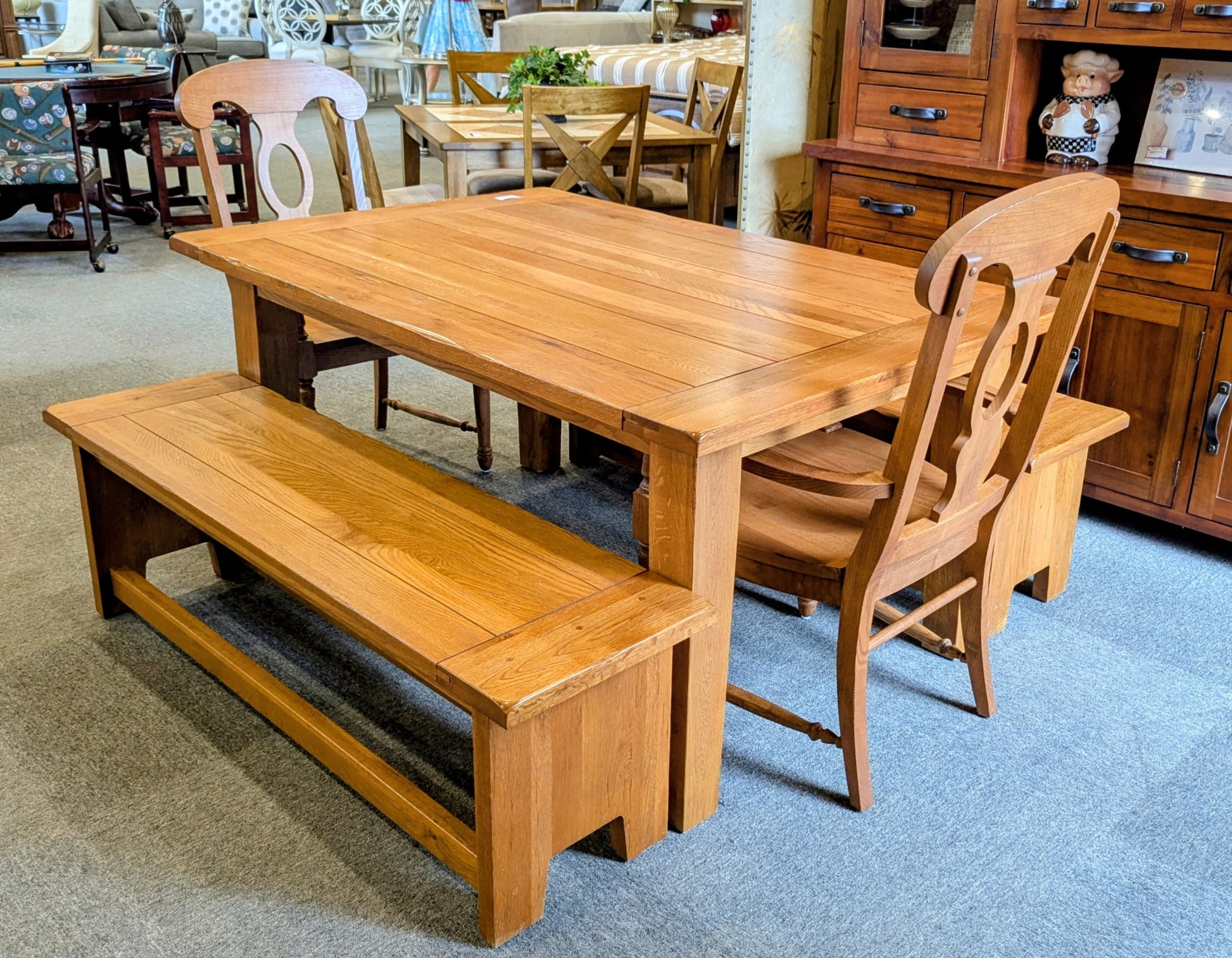 LIGHT WOOD FARMHOUSE TABLE WITH TWO BENCHES AND TWO CHAIRS.