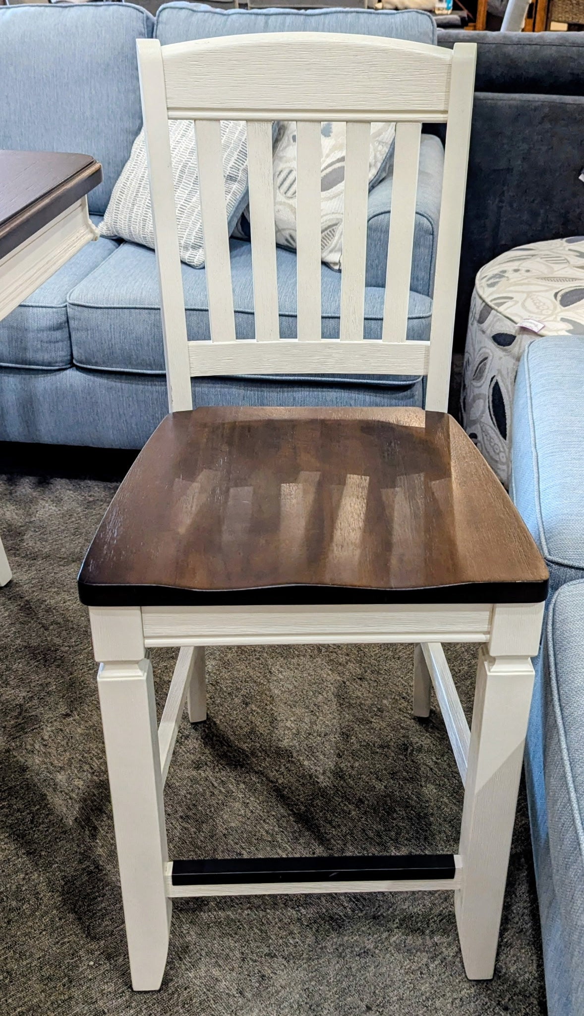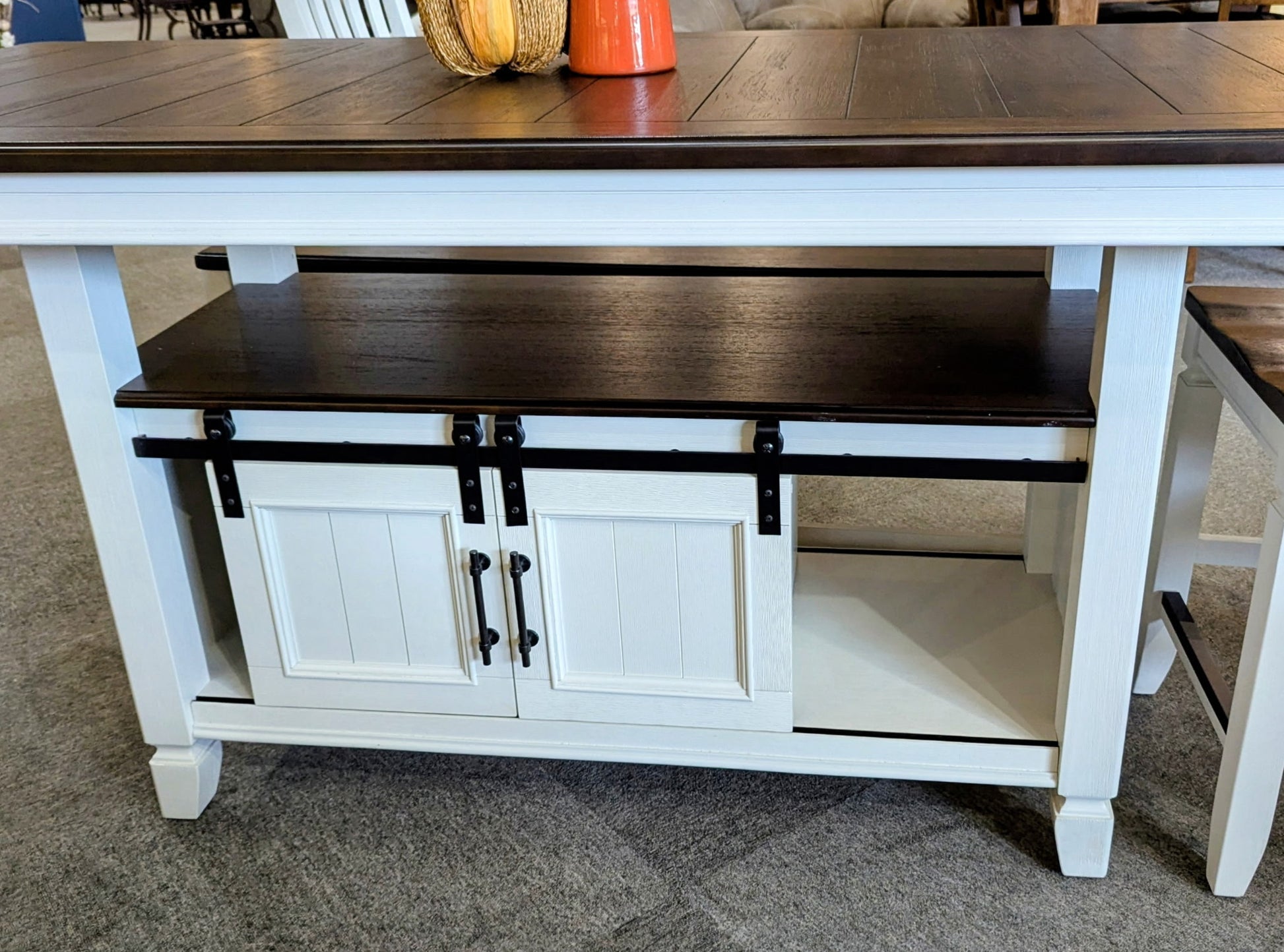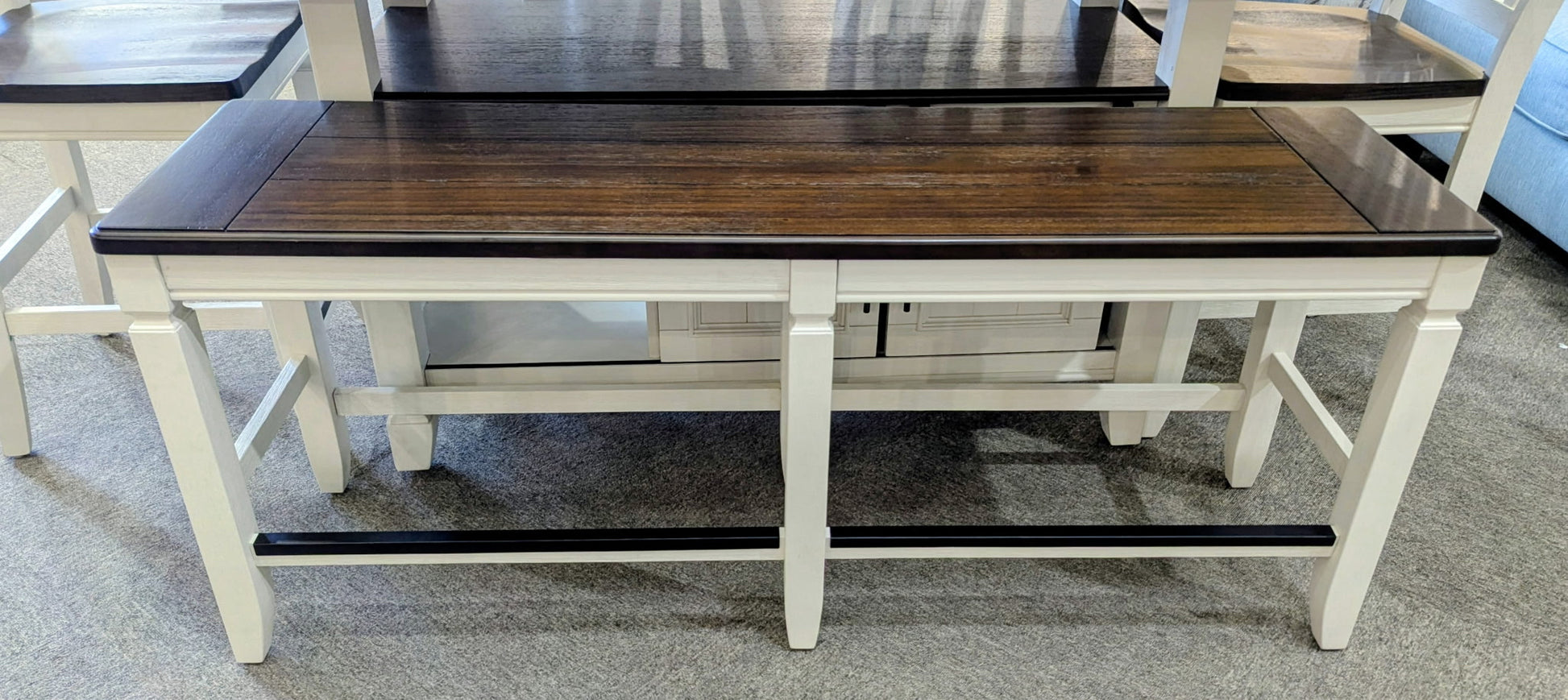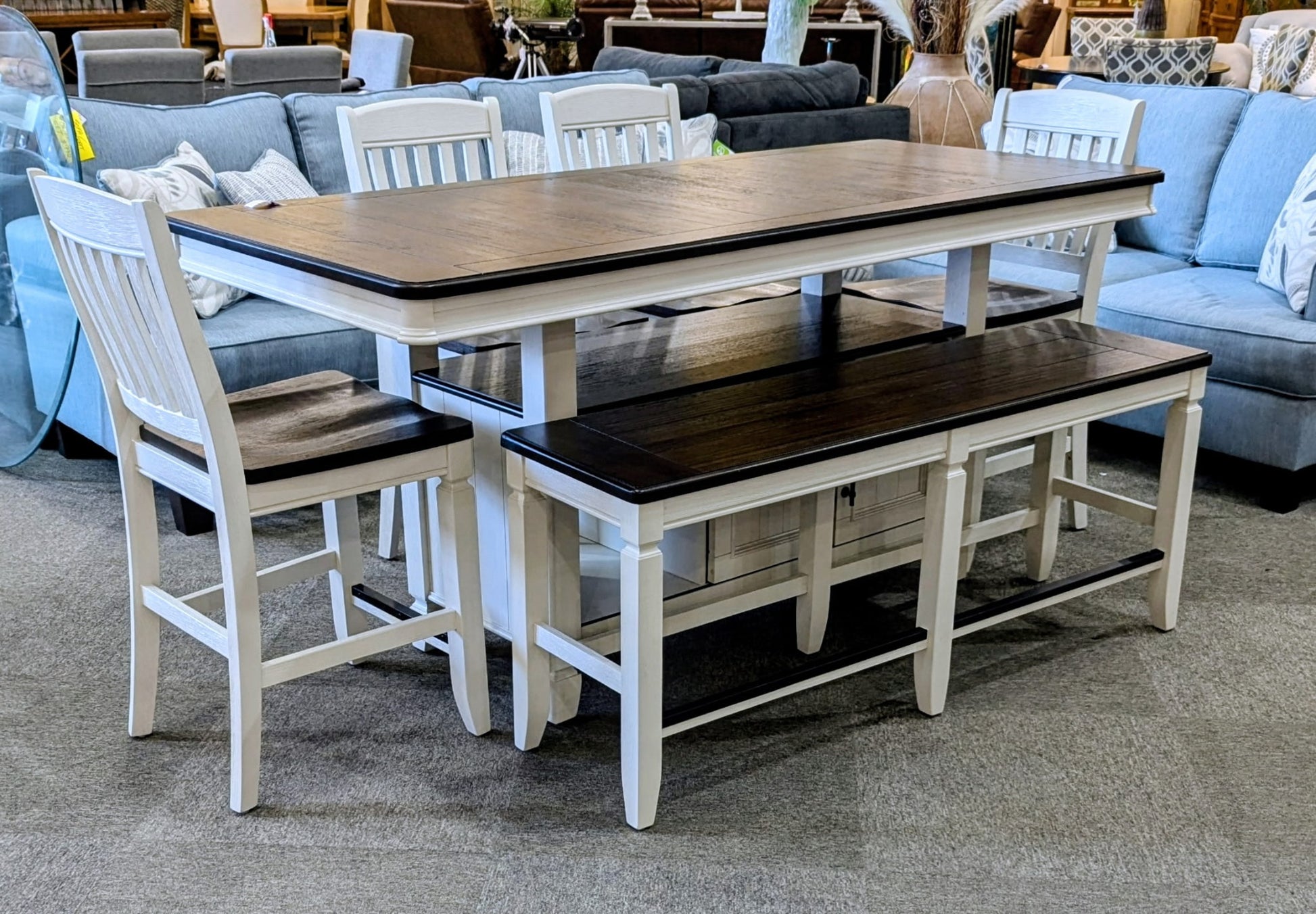 RECTANGLE TWO-TONE BROWN & WHITE DINING TABLE WITH BENCH AND FOUR CHAIRS