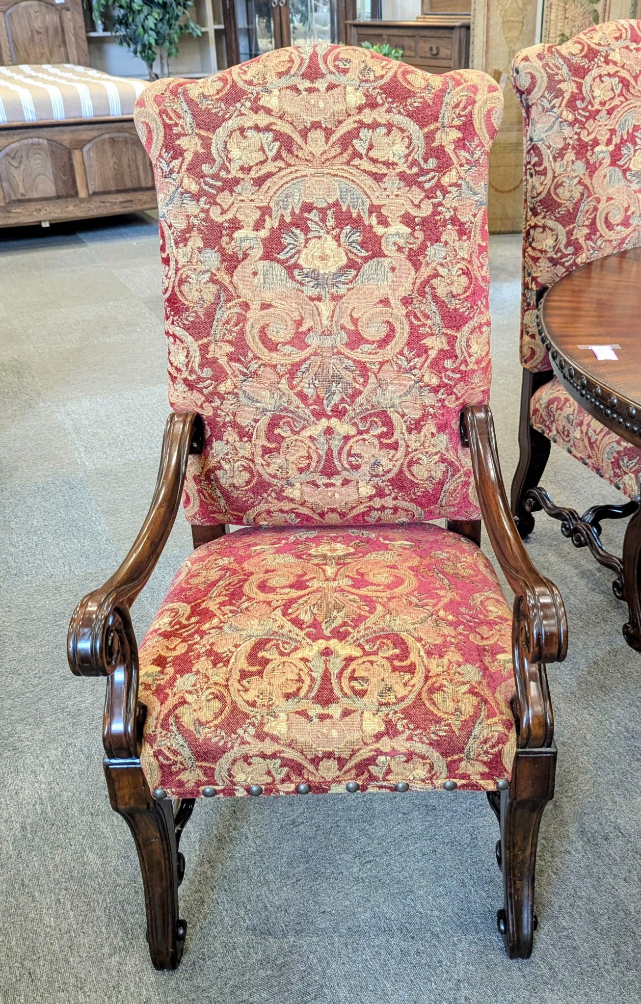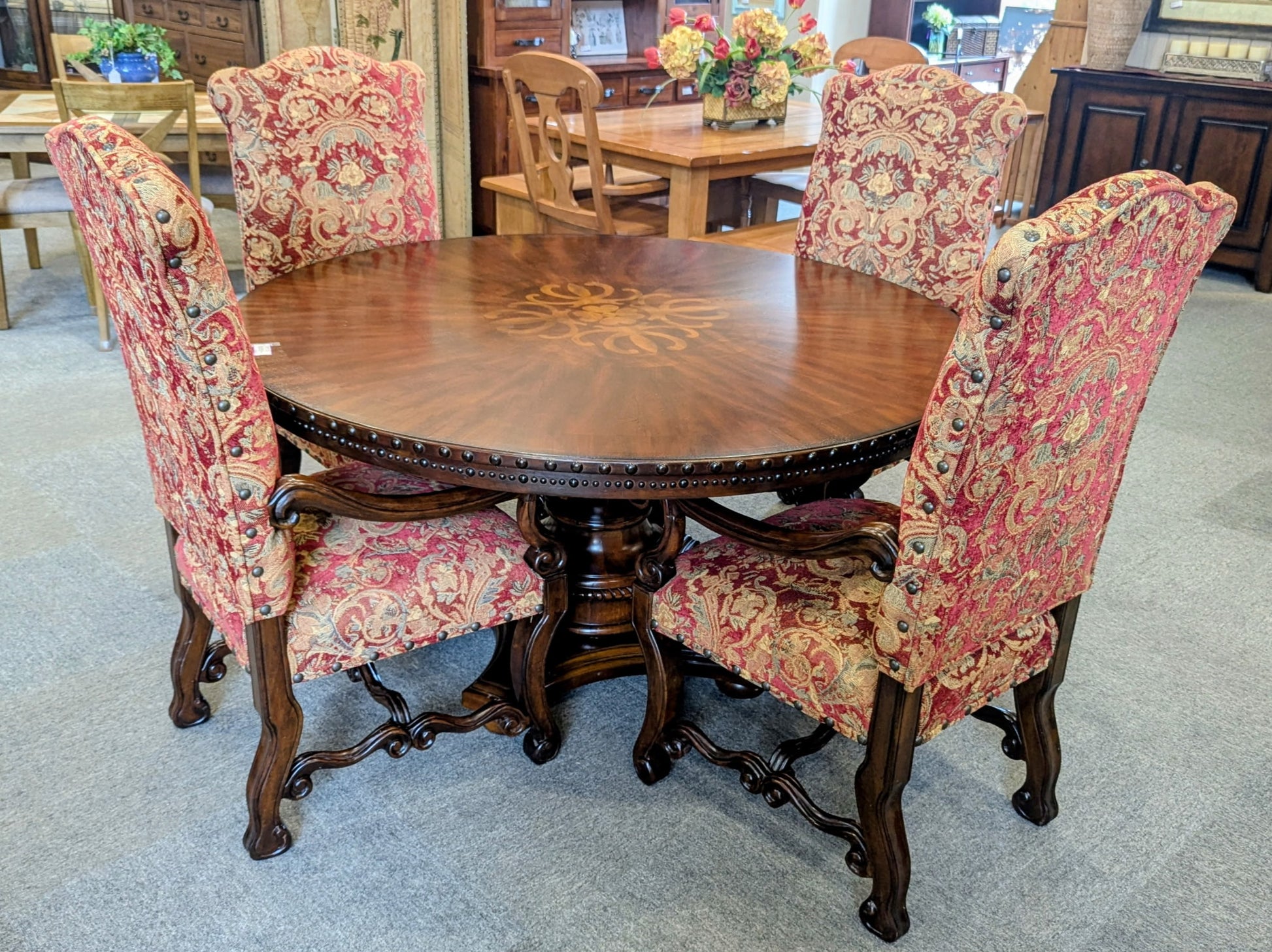 LARGE ROUND PEDESTAL BASE DINING TABLE WITH INLAY & NAILHEADS WITH FOUR RED & GOLD UPHOLSTERED CHAIRS.