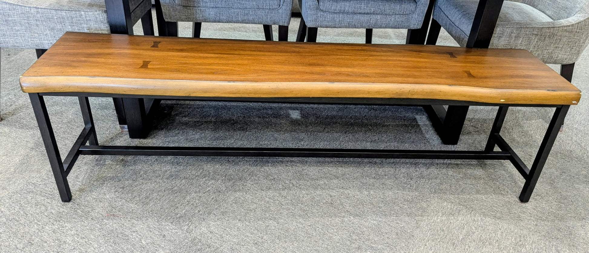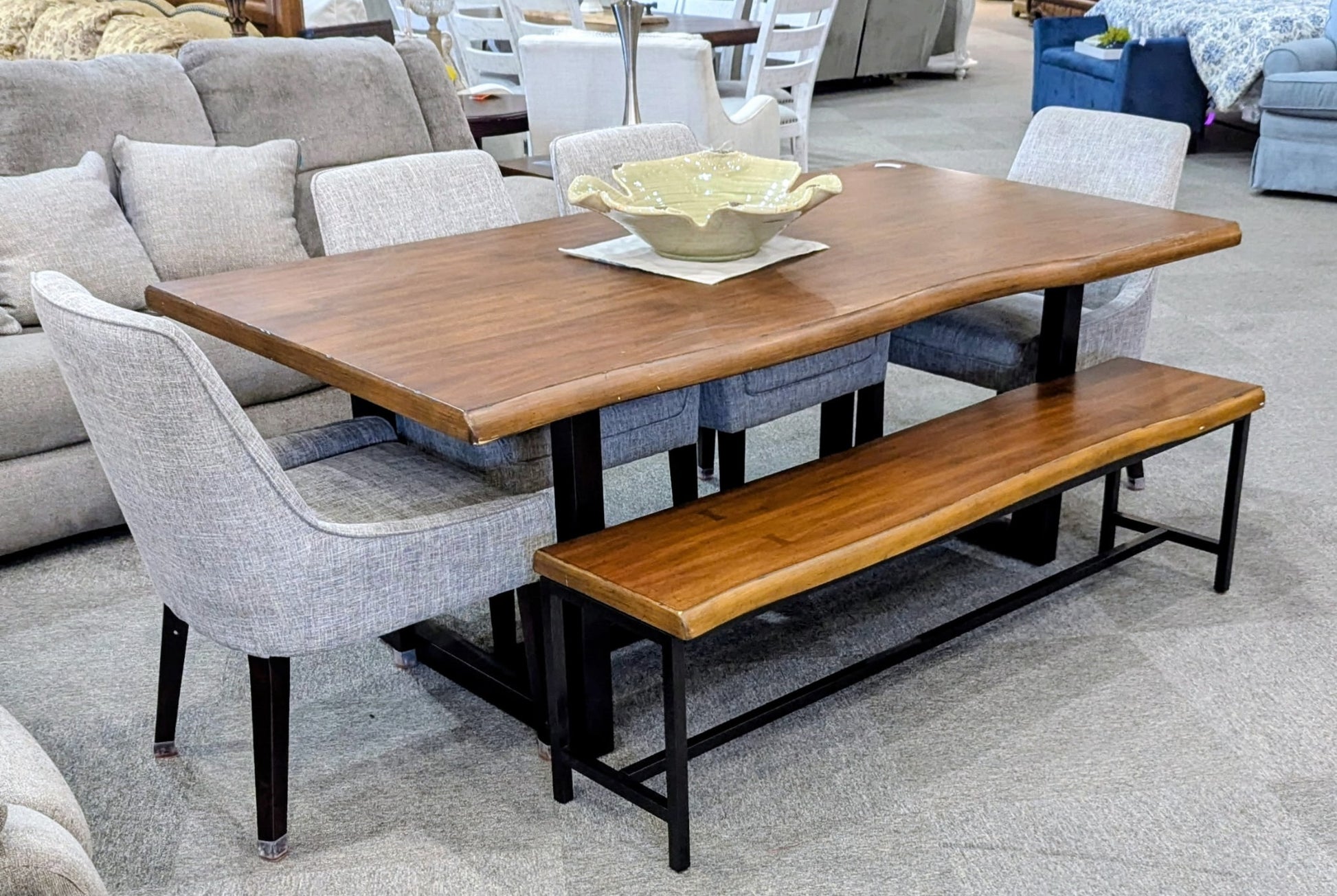 RECTANGLE LIVE EDGE TABLE WITH METAL BASE, BENCH, AND FOUR GRAY FABRIC CHAIRS.