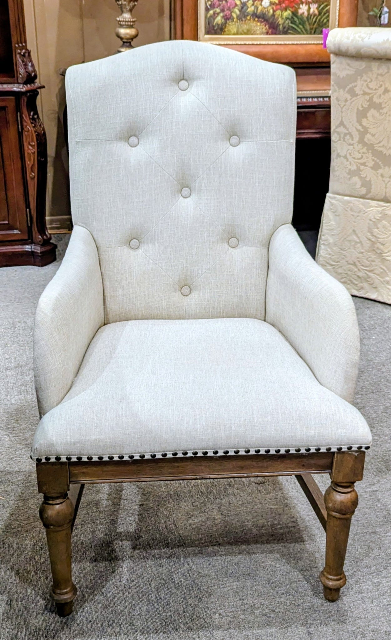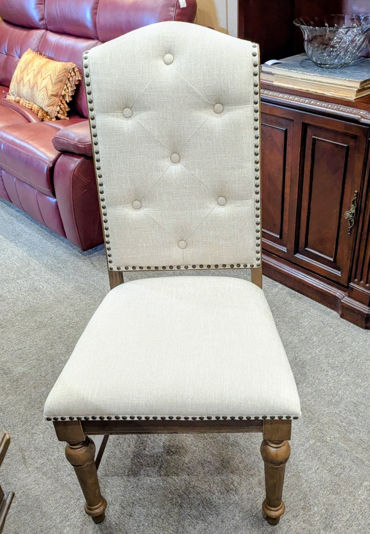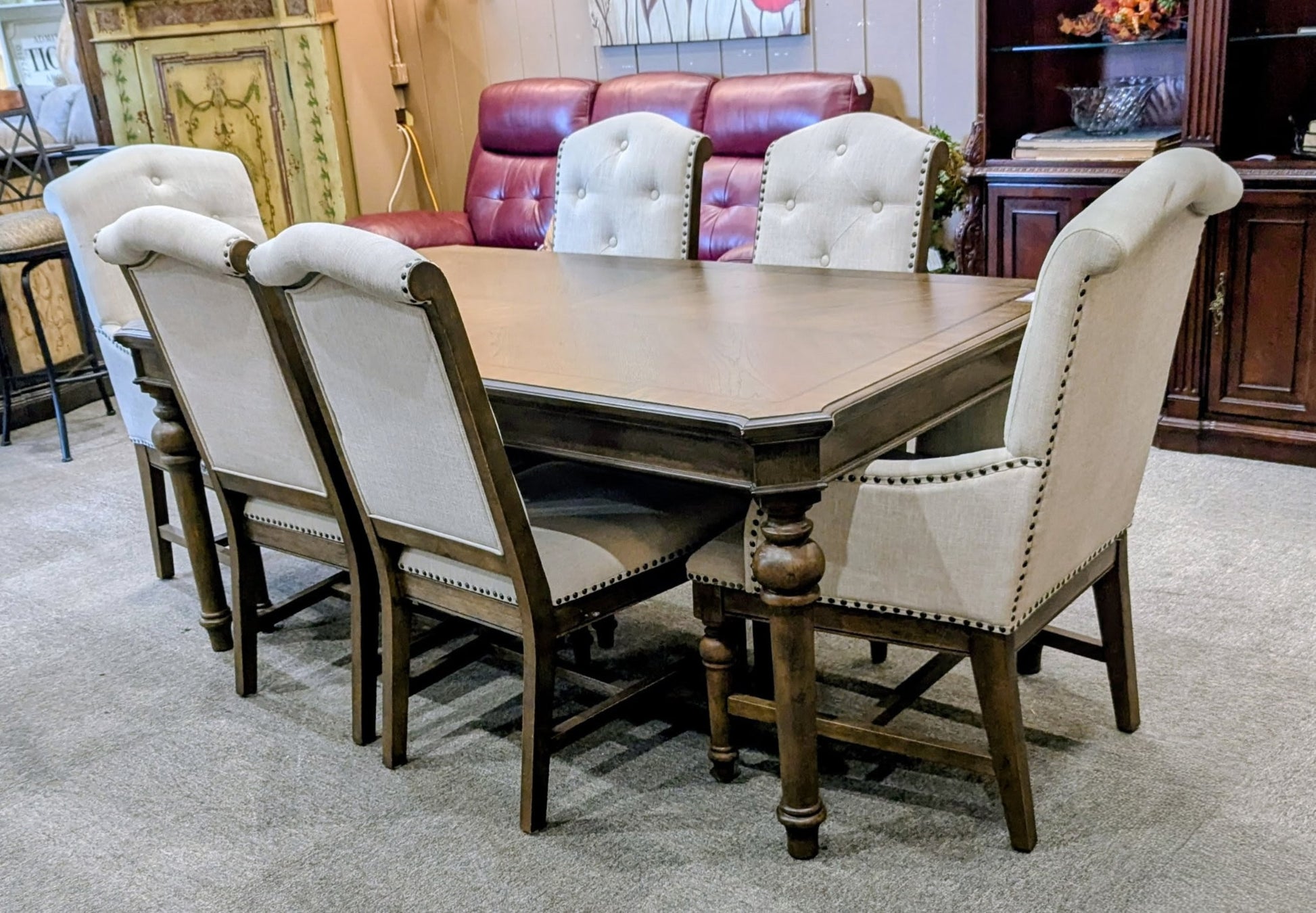 RECTANGLE DARK WOOD DINING TABLE WITH SIX CREAM UPHOLSTERED PARSON CHAIRS.