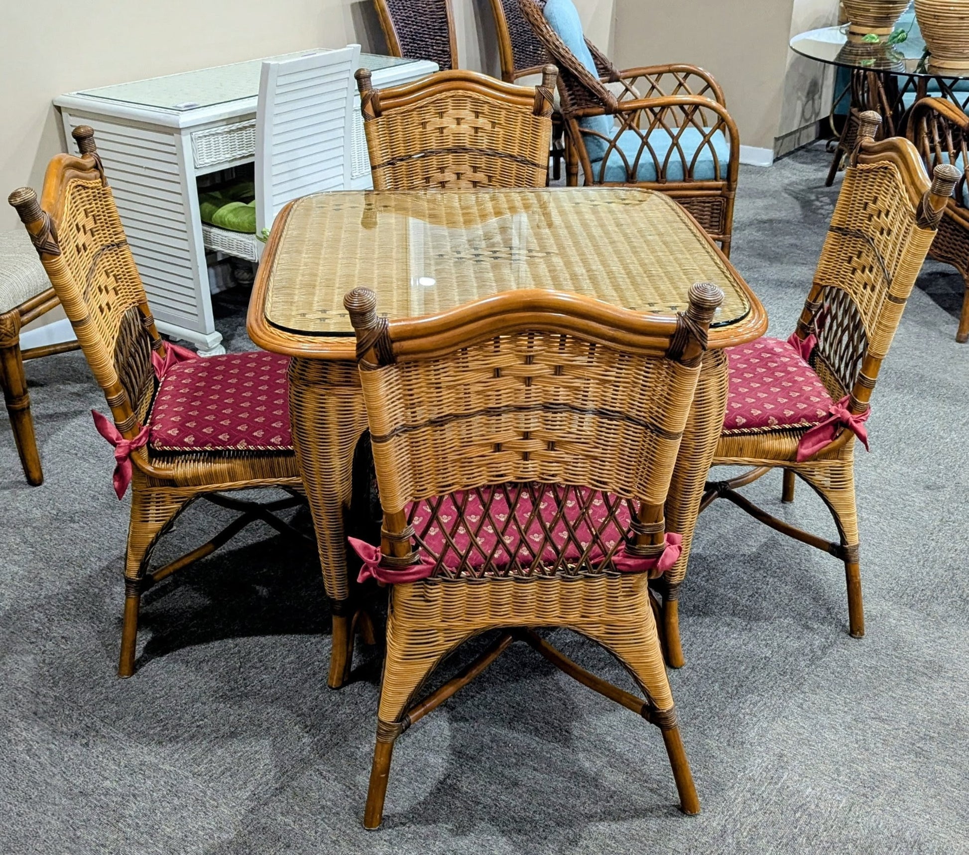 WICKER & BAMBOO DINETTE TABLE WITH GLASS TOP AND FOUR CHAIRS