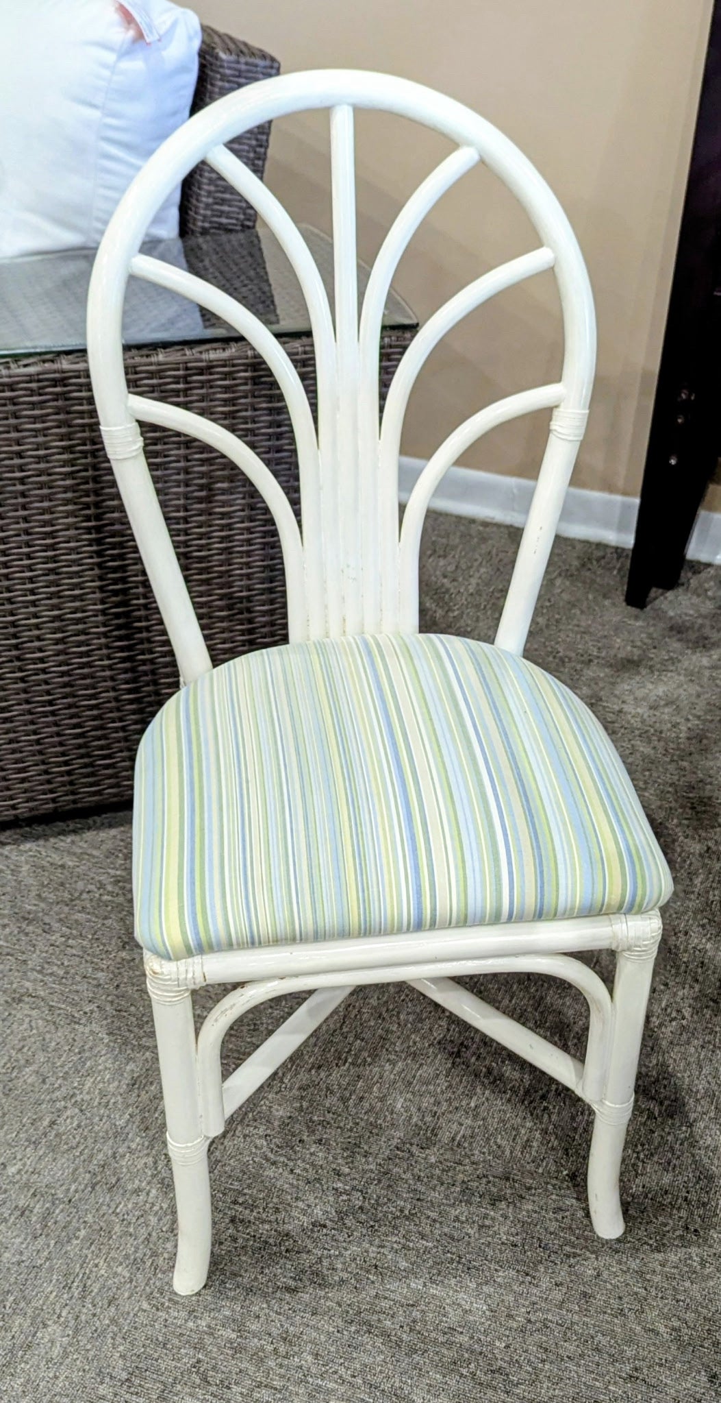 RATTAN BASE DINETTE TABLE WITH ROUND GLASS TOP AND FOUR CHAIRS WITH STRIPED SEATS.