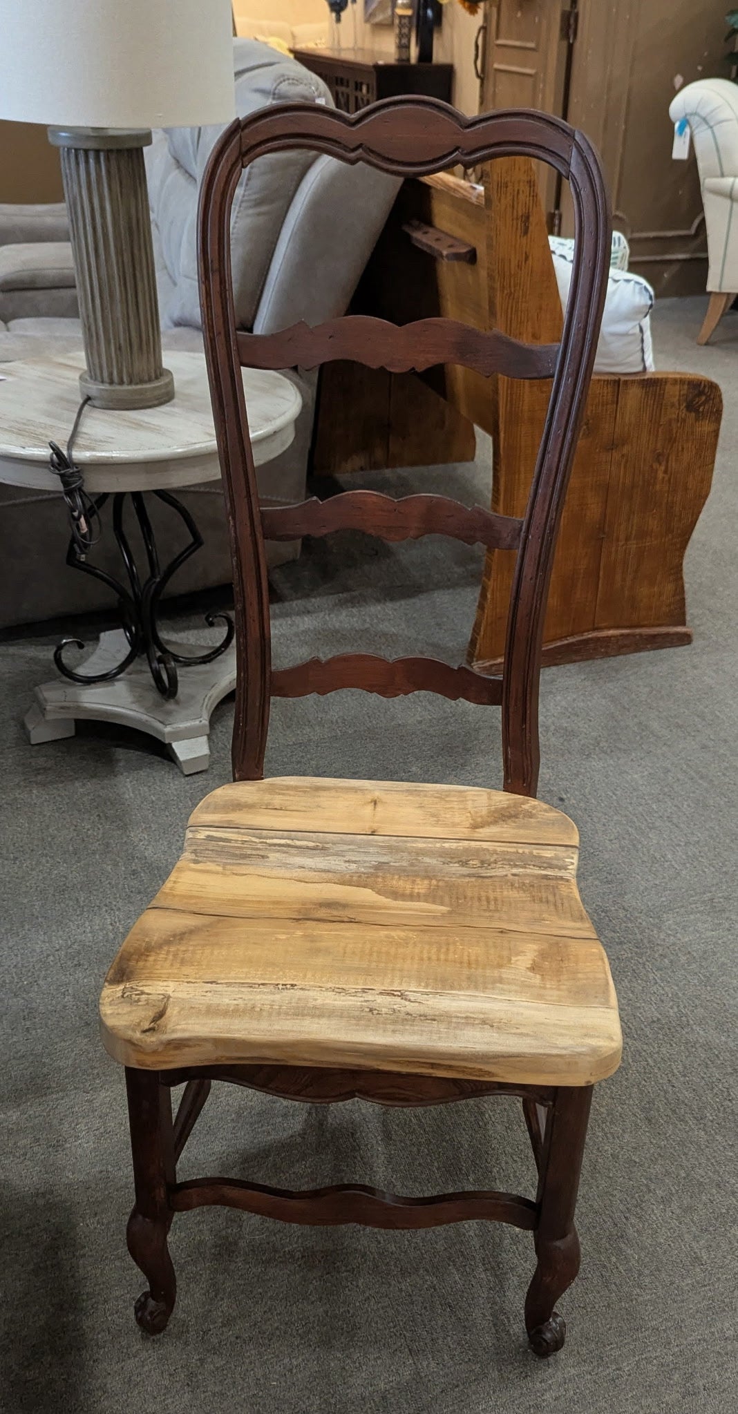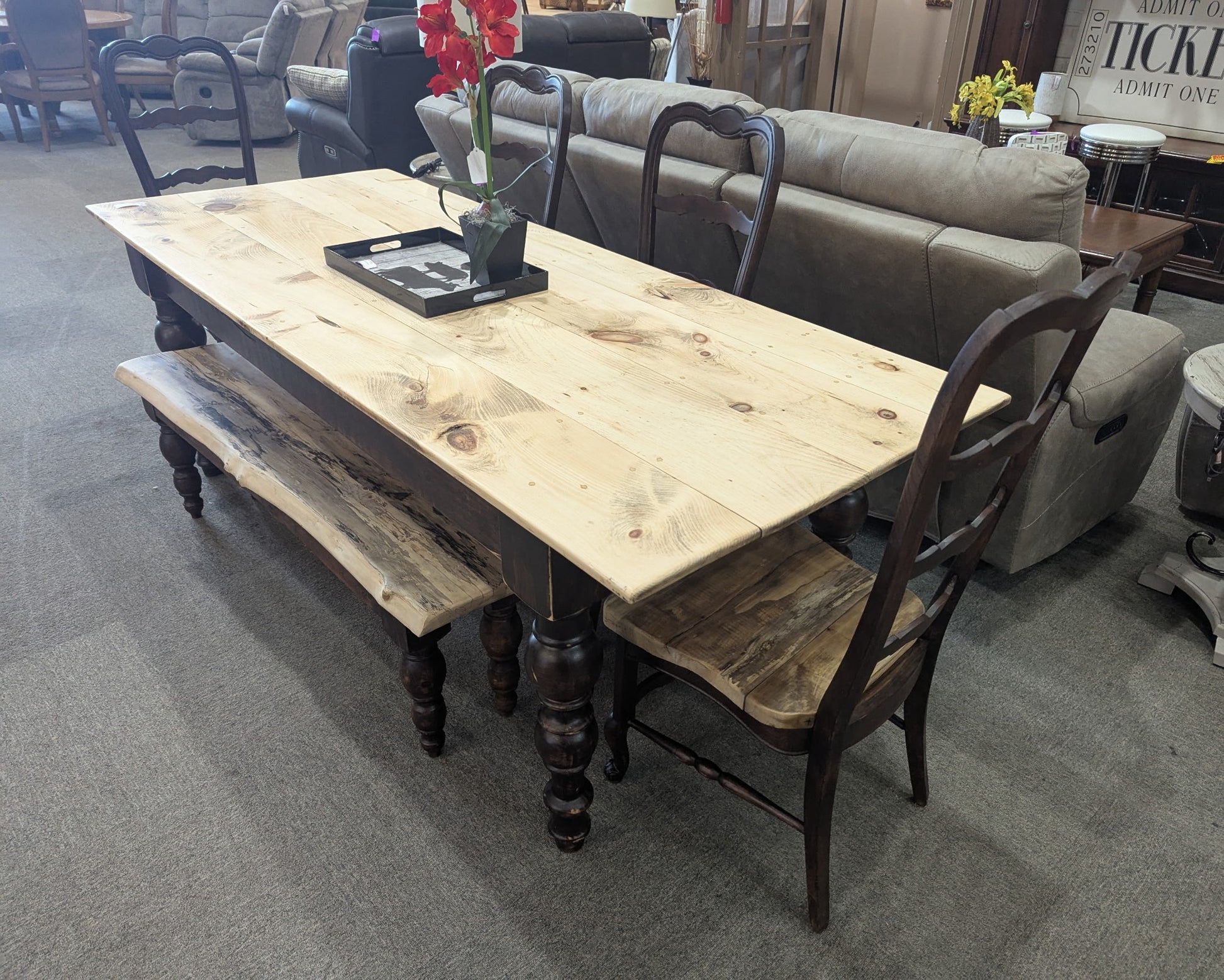 CUSTOM MADE PINE FARMHOUSE DINING TABLE WITH POPLAR WOOD BENCH AND FOUR CHAIRS.