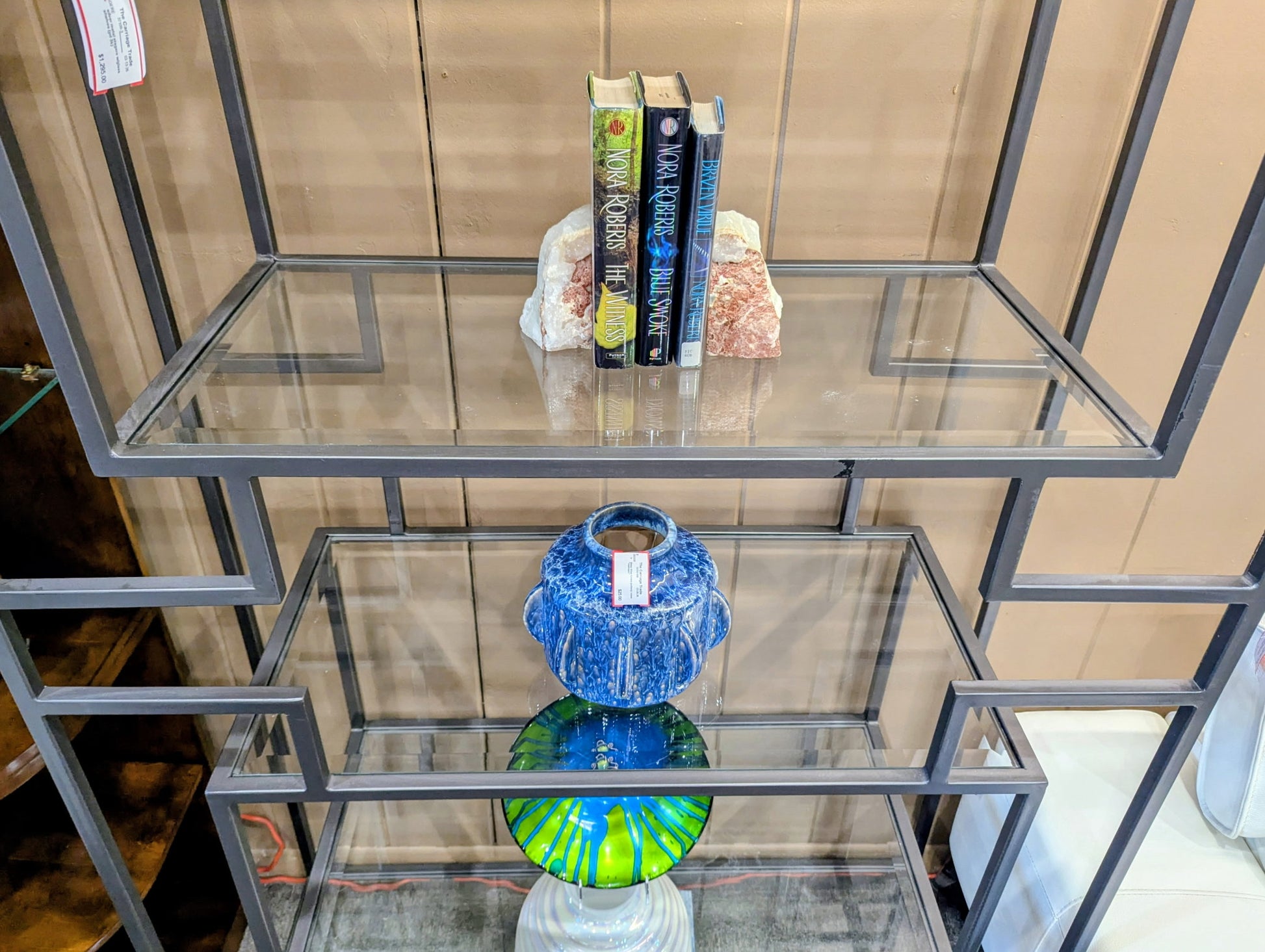 METAL ETAGERE WITH GLASS SHELVES. (PAID 3K NEW)