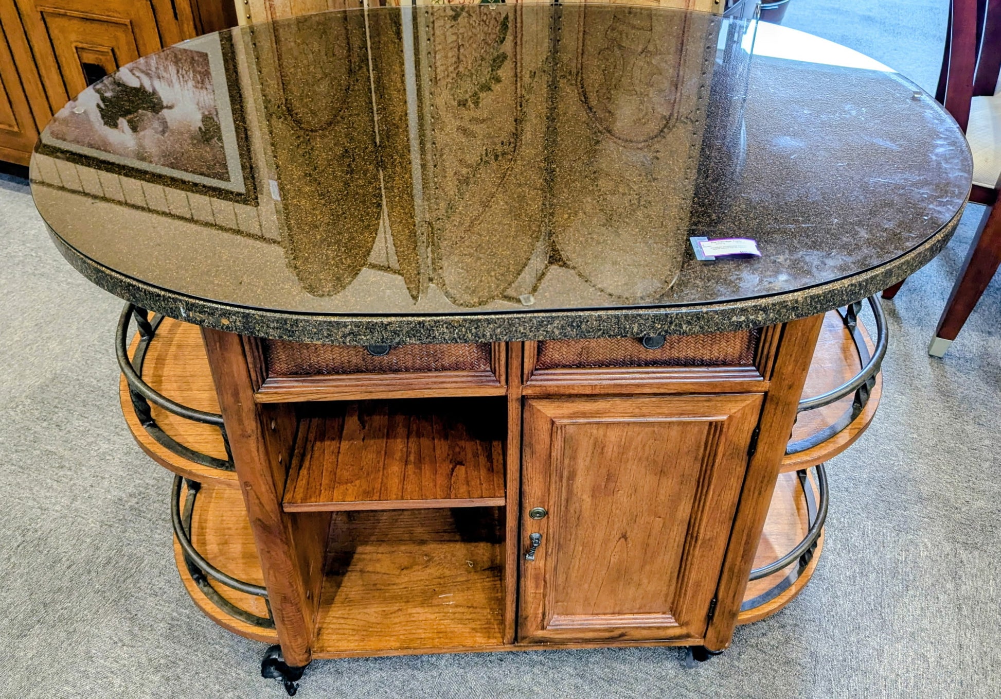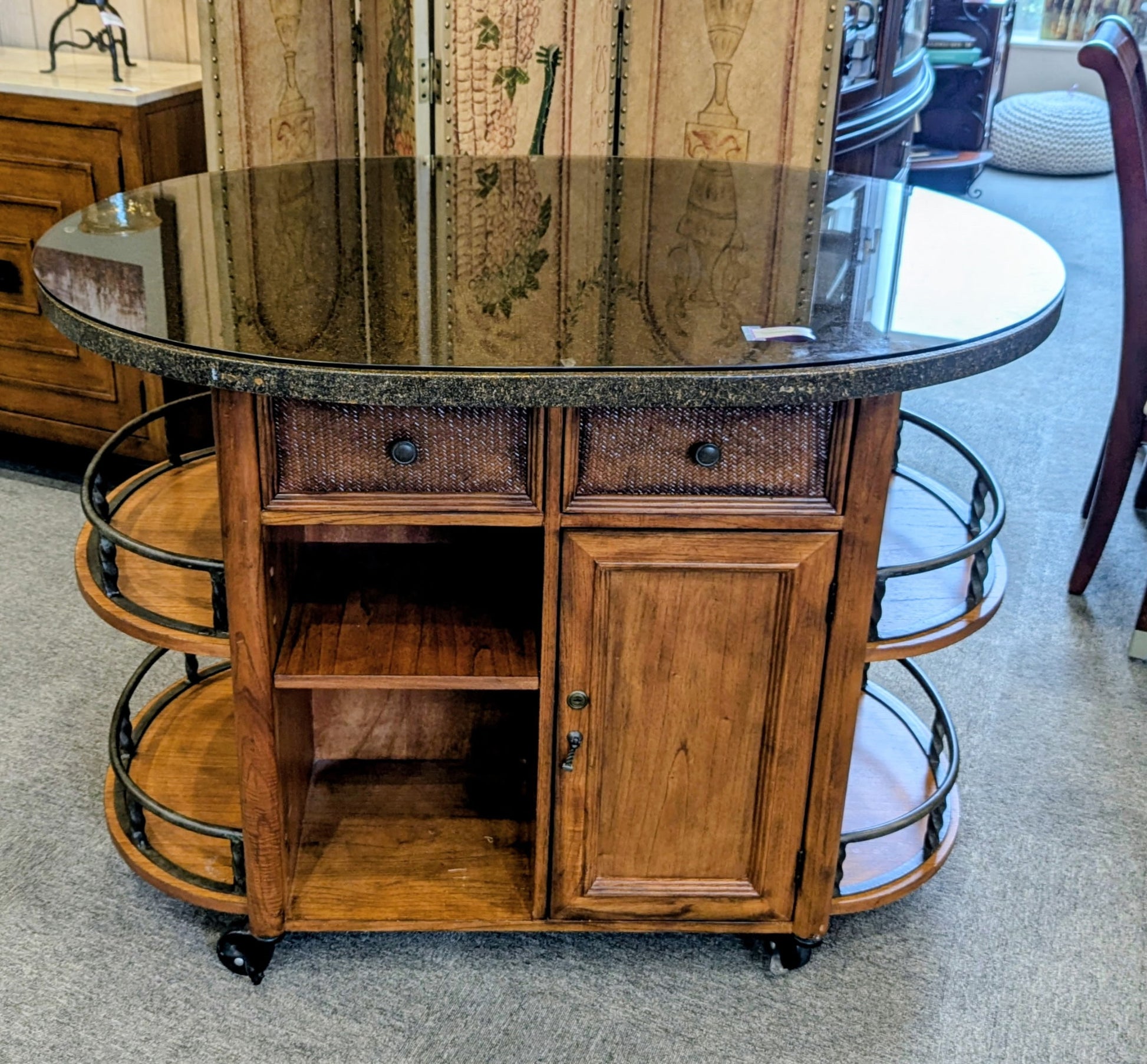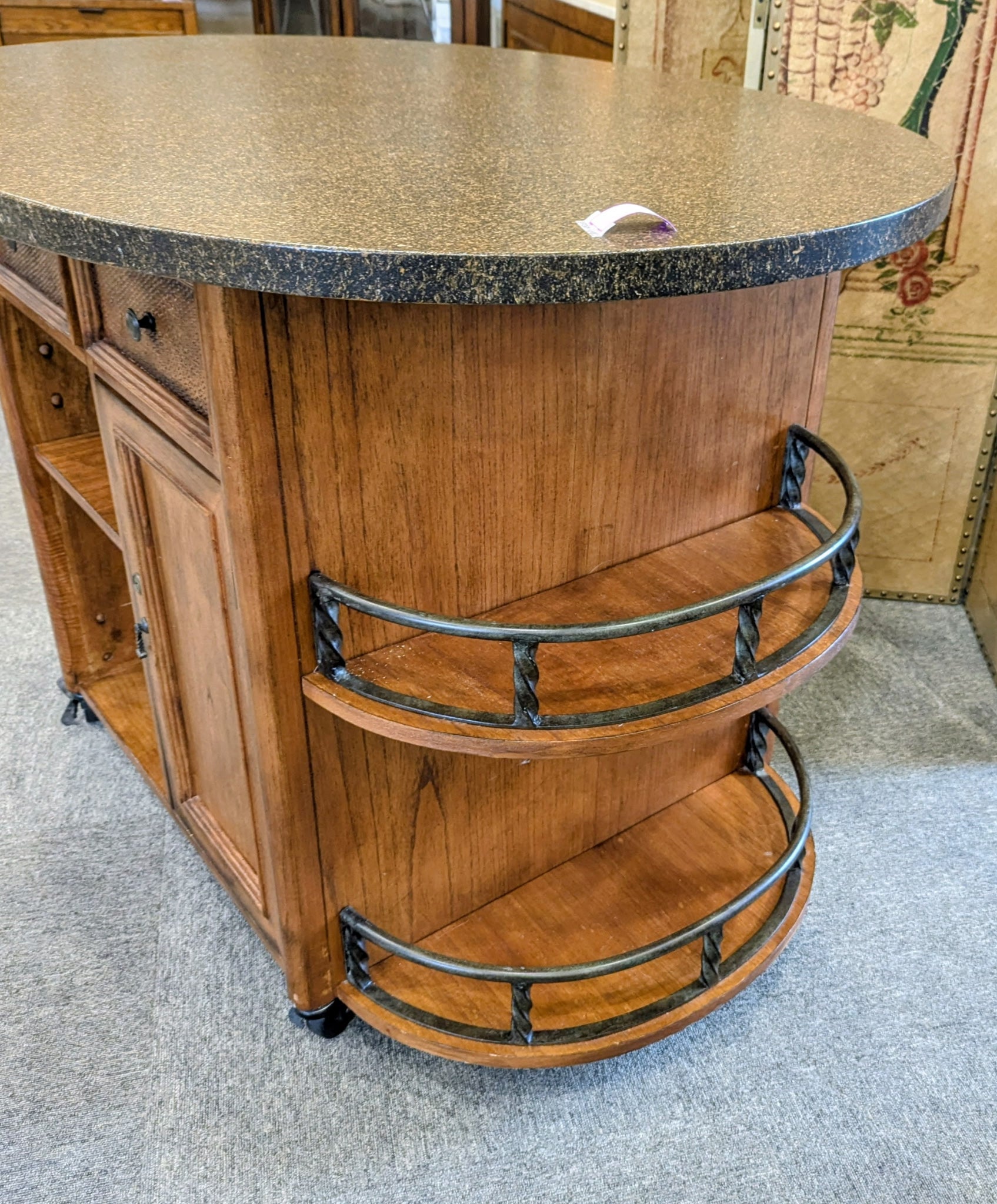 WOOD AND METAL KITCHEN ISLAND WITH OVAL TOP ON CASTERS
