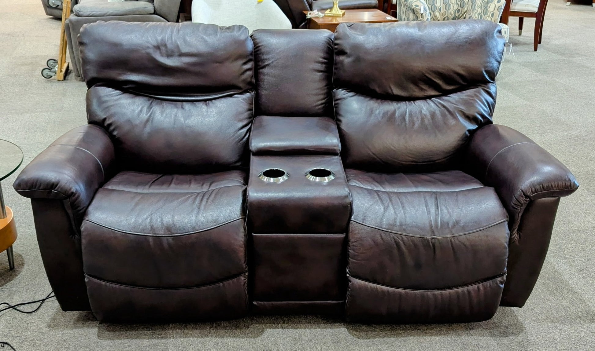 DARK BROWN LEATHER POWER RECLINING LOVESEAT WITH MIDDLE CONSOLE.