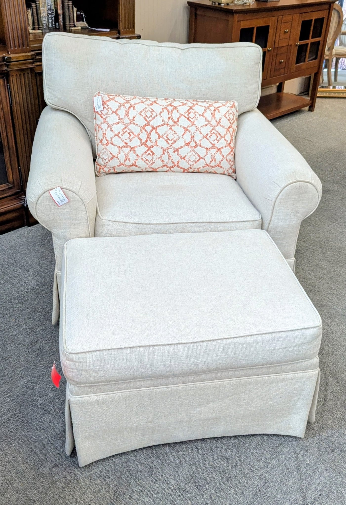 FABRIC CHAIR WITH OTTOMAN AND THROW PILLOW. AS IS (SOILING)