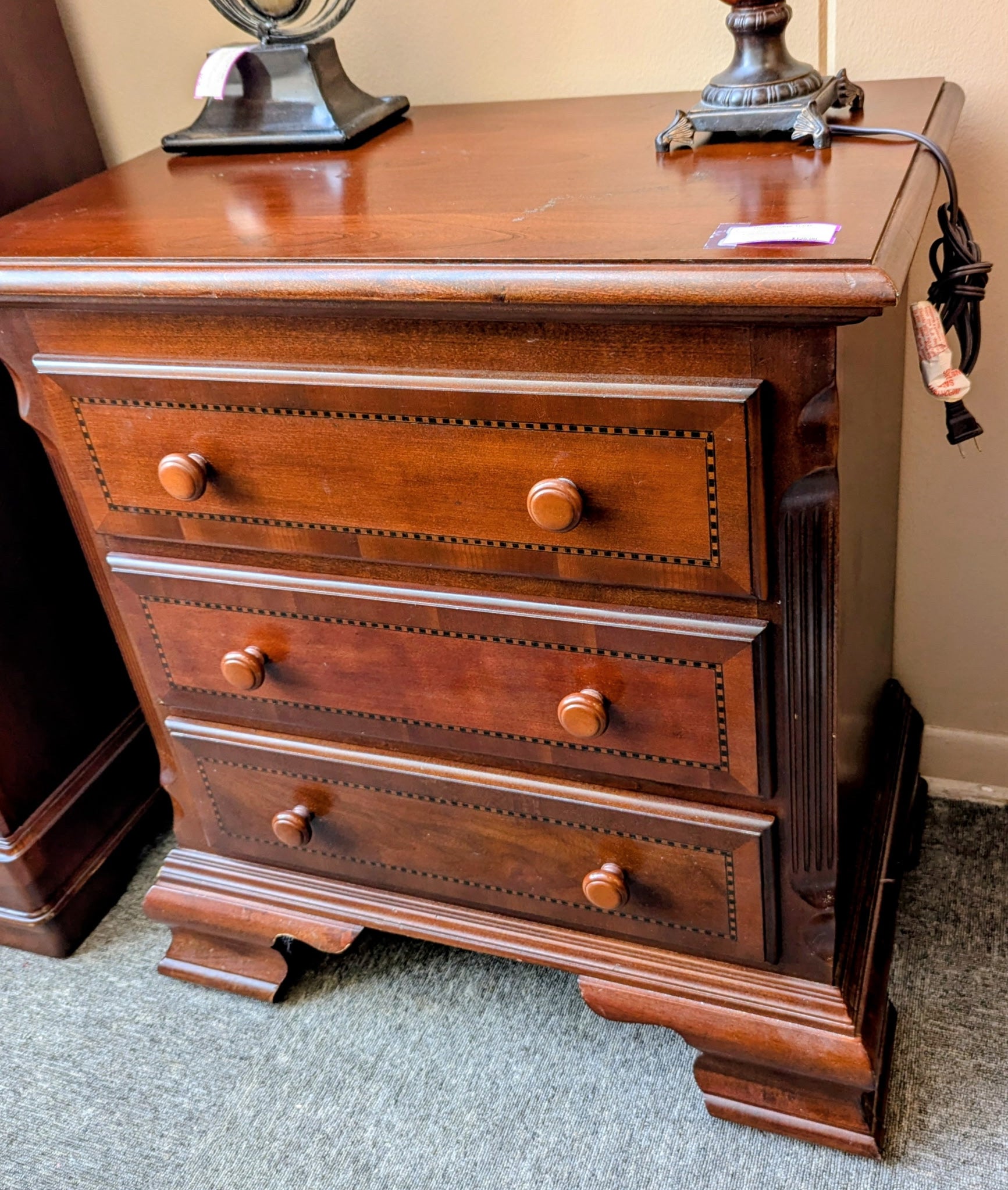 DARK CHERRY THREE DRAWER NIGHTSTAND. AS IS.