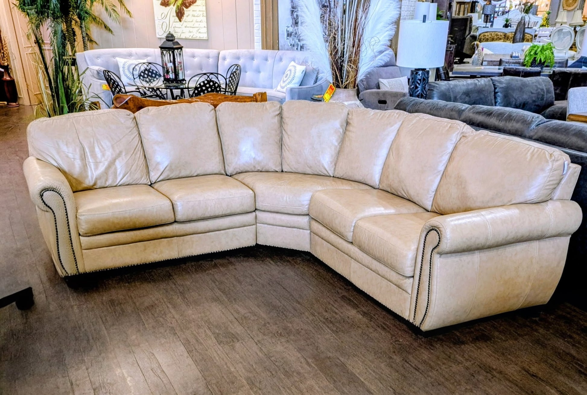 THREE PIECE CAMEL COLOR GENUINE LEATHER SECTIONAL WITH NAILHEADS.