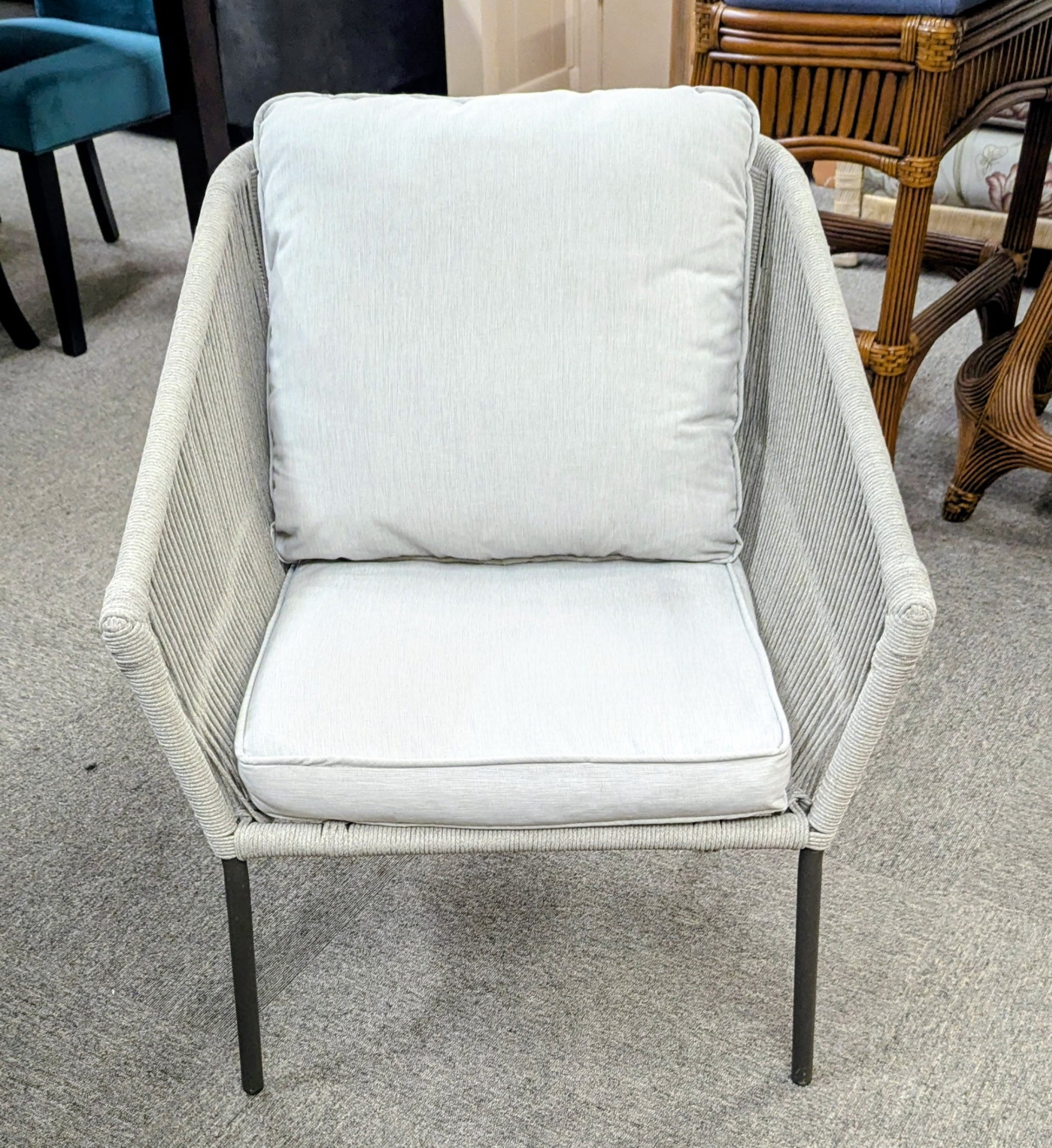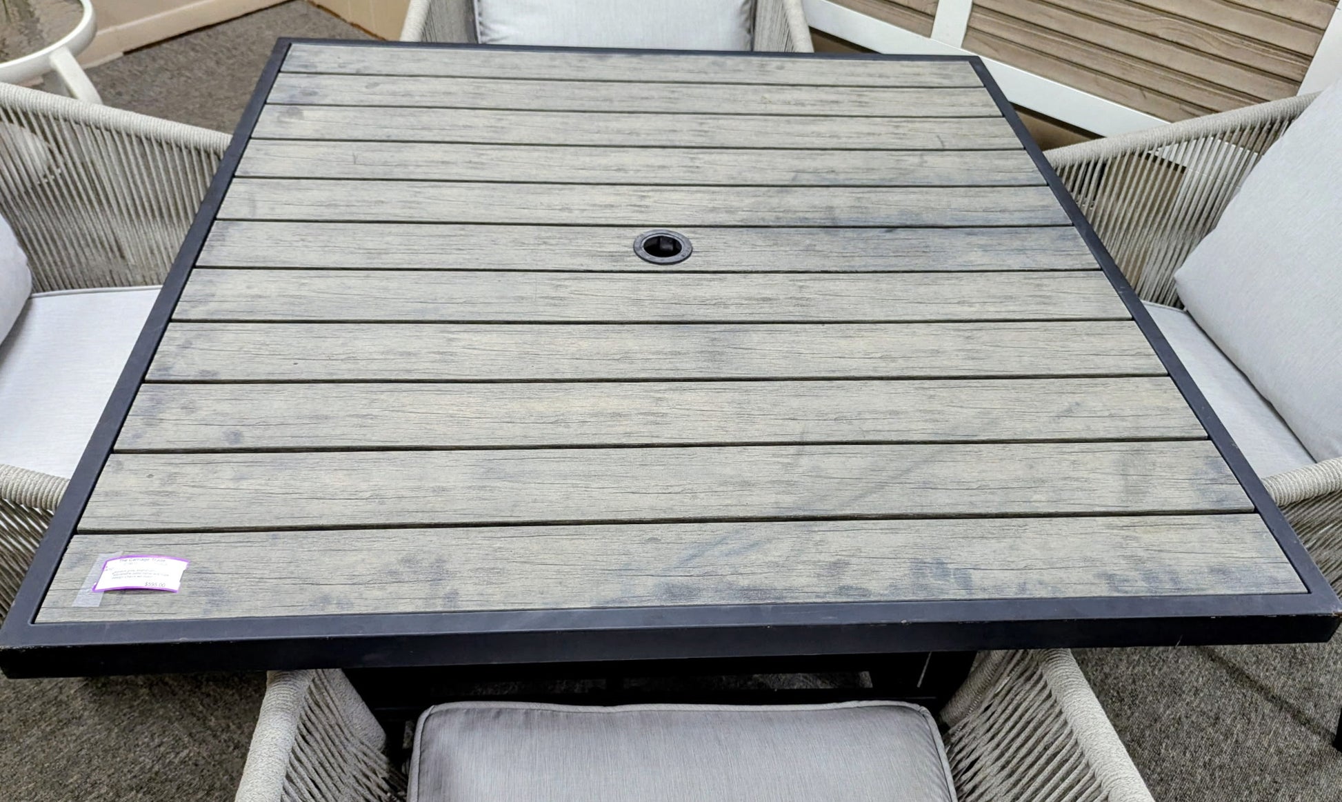 SQUARE GRAY ALUMINUM ADJUSTABLE PATIO TABLE WITH FOUR ROPE DESIGN CHAIRS WITH CREAM CUSHIONS.