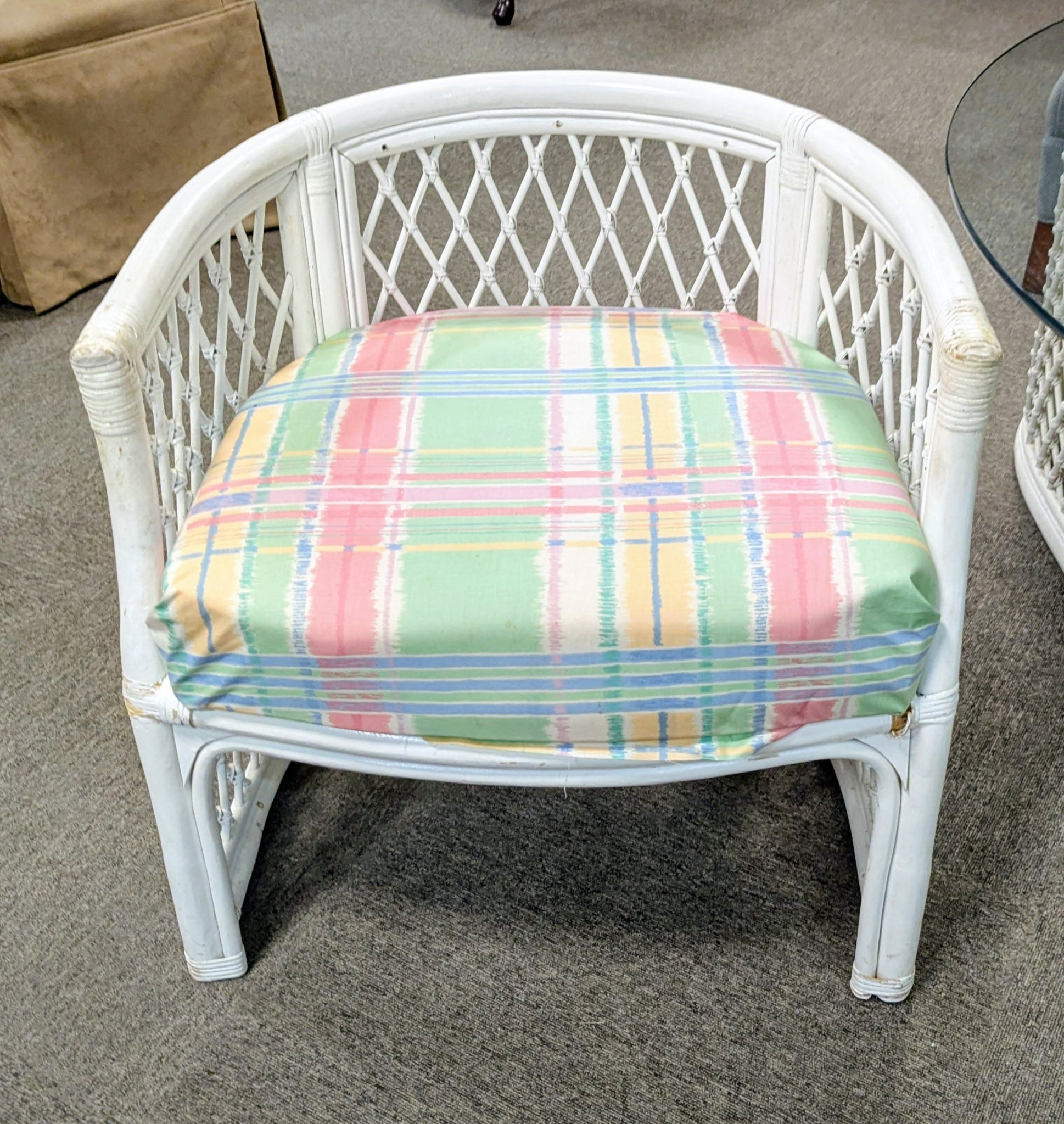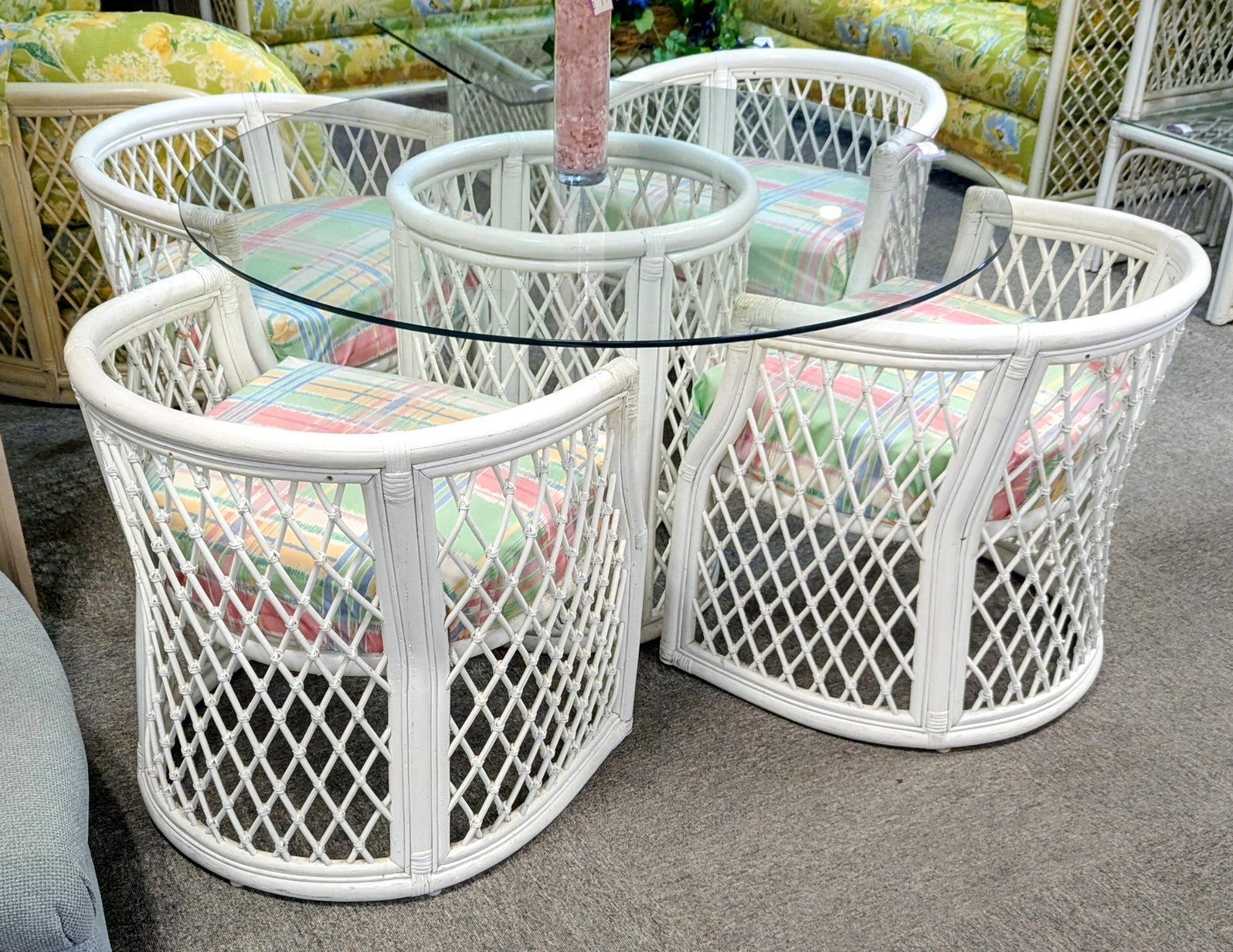 ROUND WHITE RATTAN BASE PATIO TABLE WITH ROUND GLASS TOP AND SIX PATIO CHAIRS. AS IS.