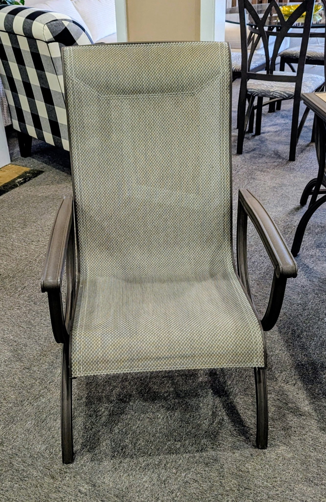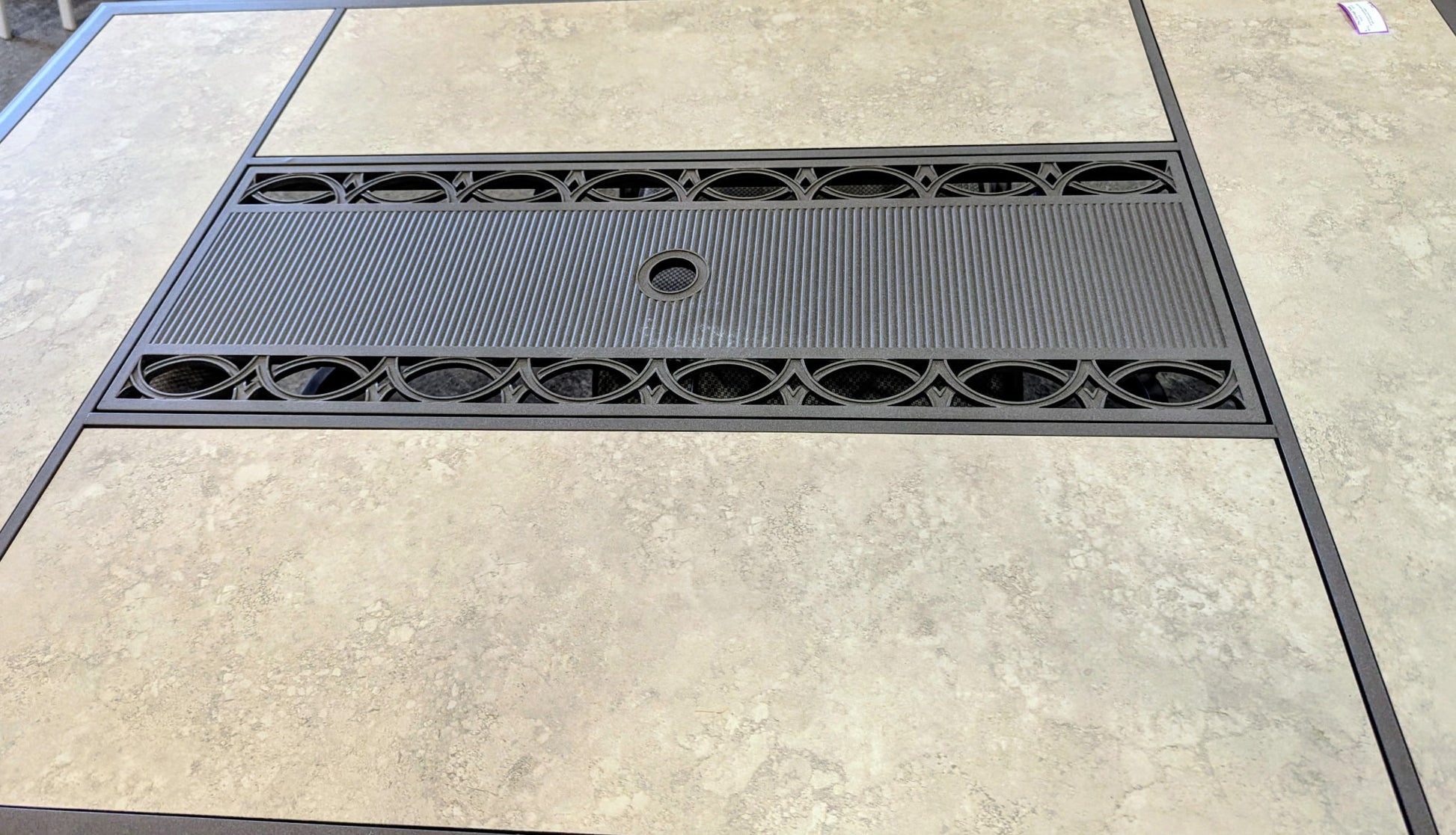 RECTANGLE METAL AND TILE PATIO TABLE WITH FOUR SLINGBACK CHAIRS.