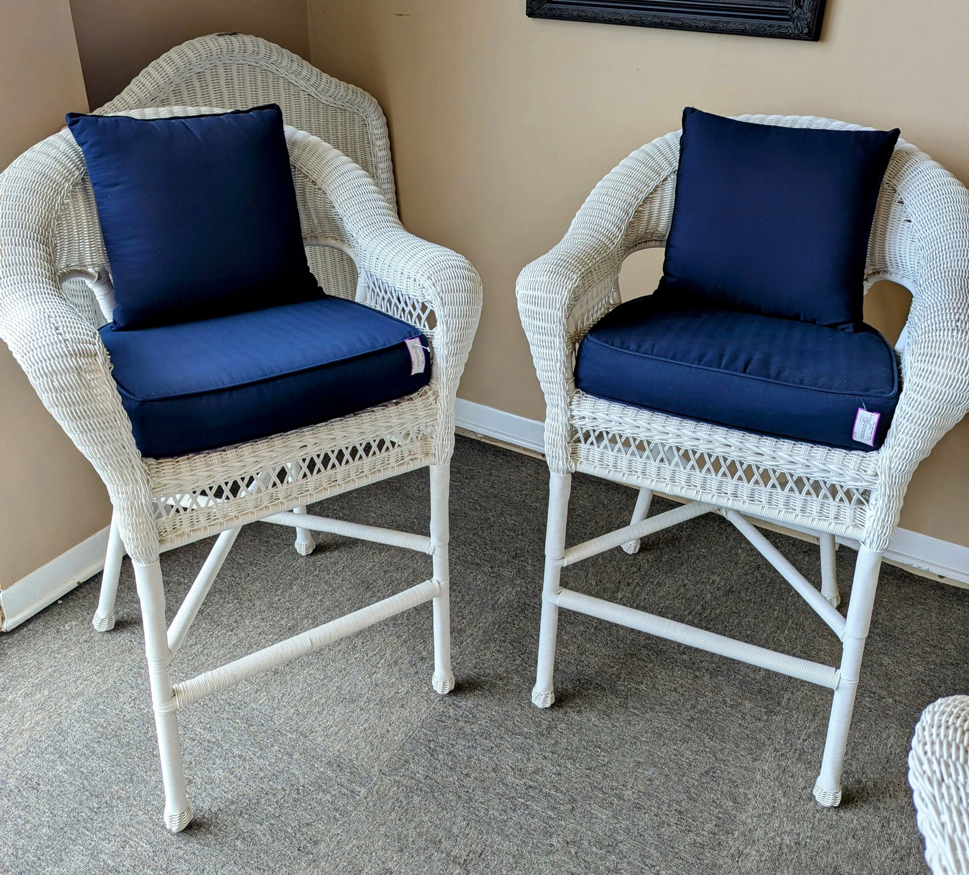 PAIR OF WHITE WICKER PATIO PUB CHAIRS WITH NAVY BLUE CUSHIONS.