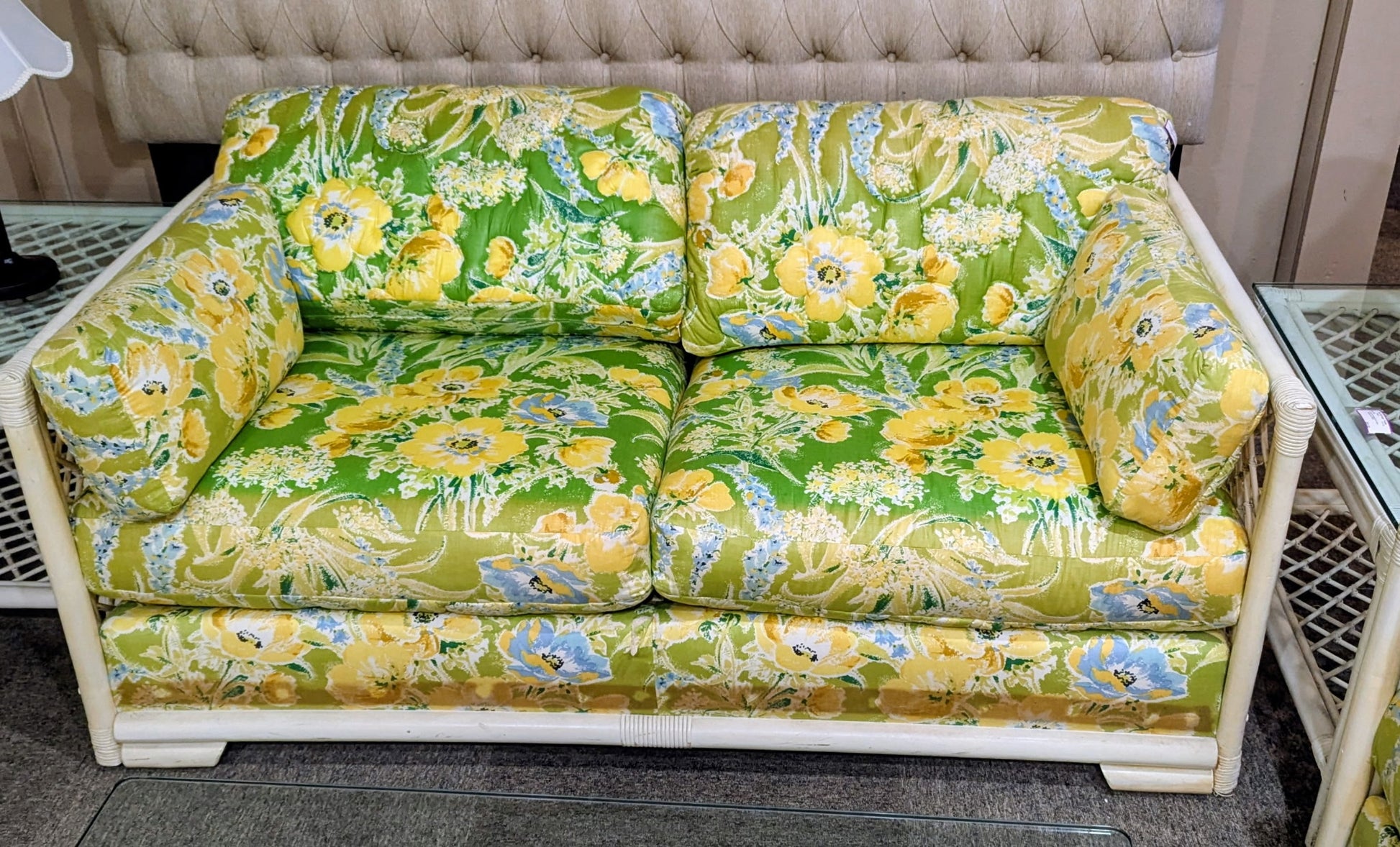 RATTAN LOVESEAT WITH LIME GREEN AND YELLOW FLORAL CUSHION. AS IS.