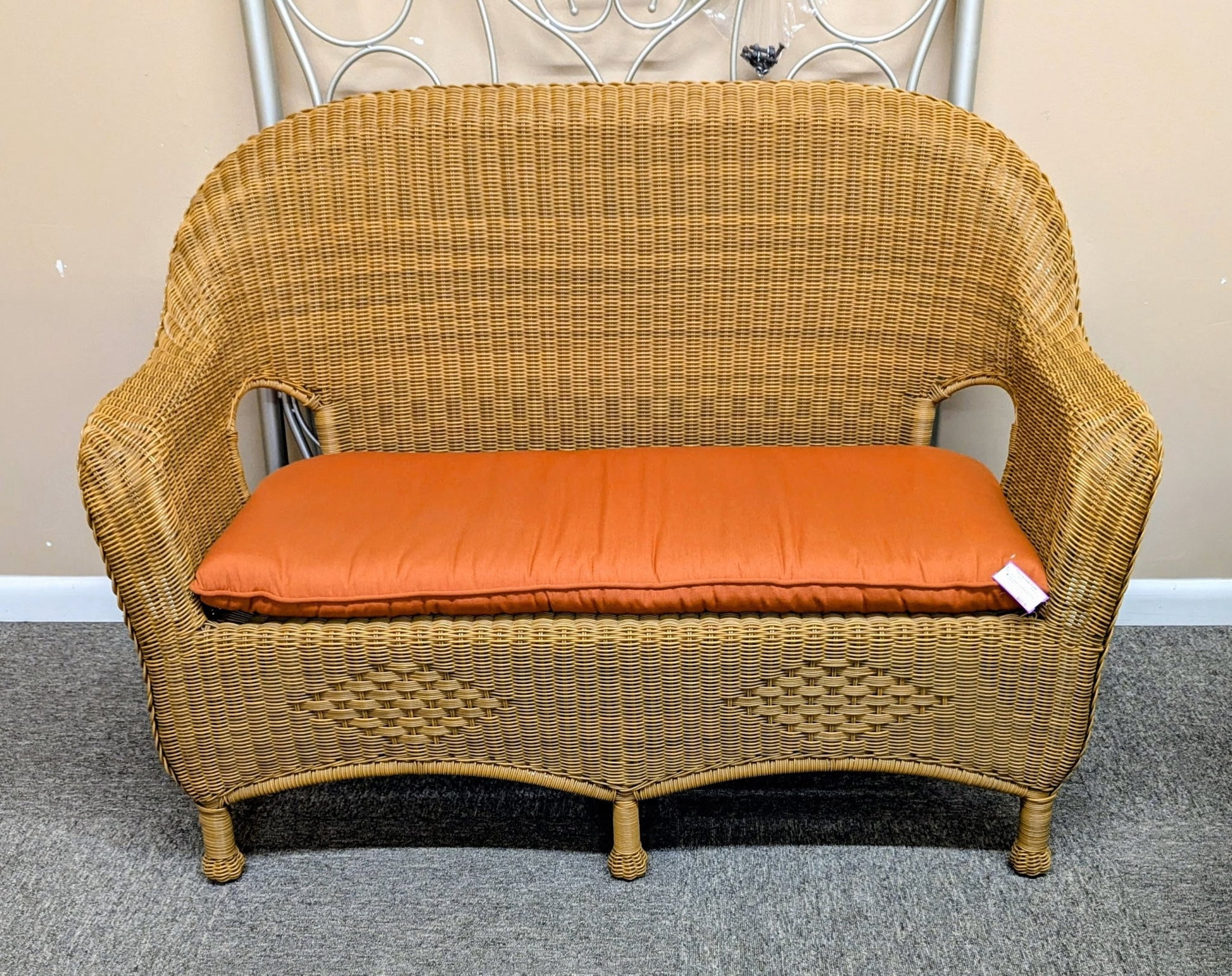 FAUX WICKER LOVESEAT WITH ORANGE CUSHION