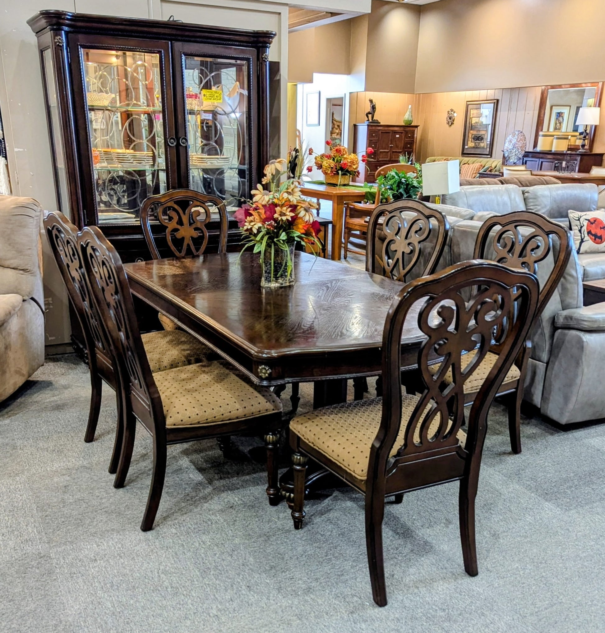 SET DARK WOOD DINING TABLE WITH TWO LEAVES, SIX CHAIRS, AND TWO-PIECE HUTCH.