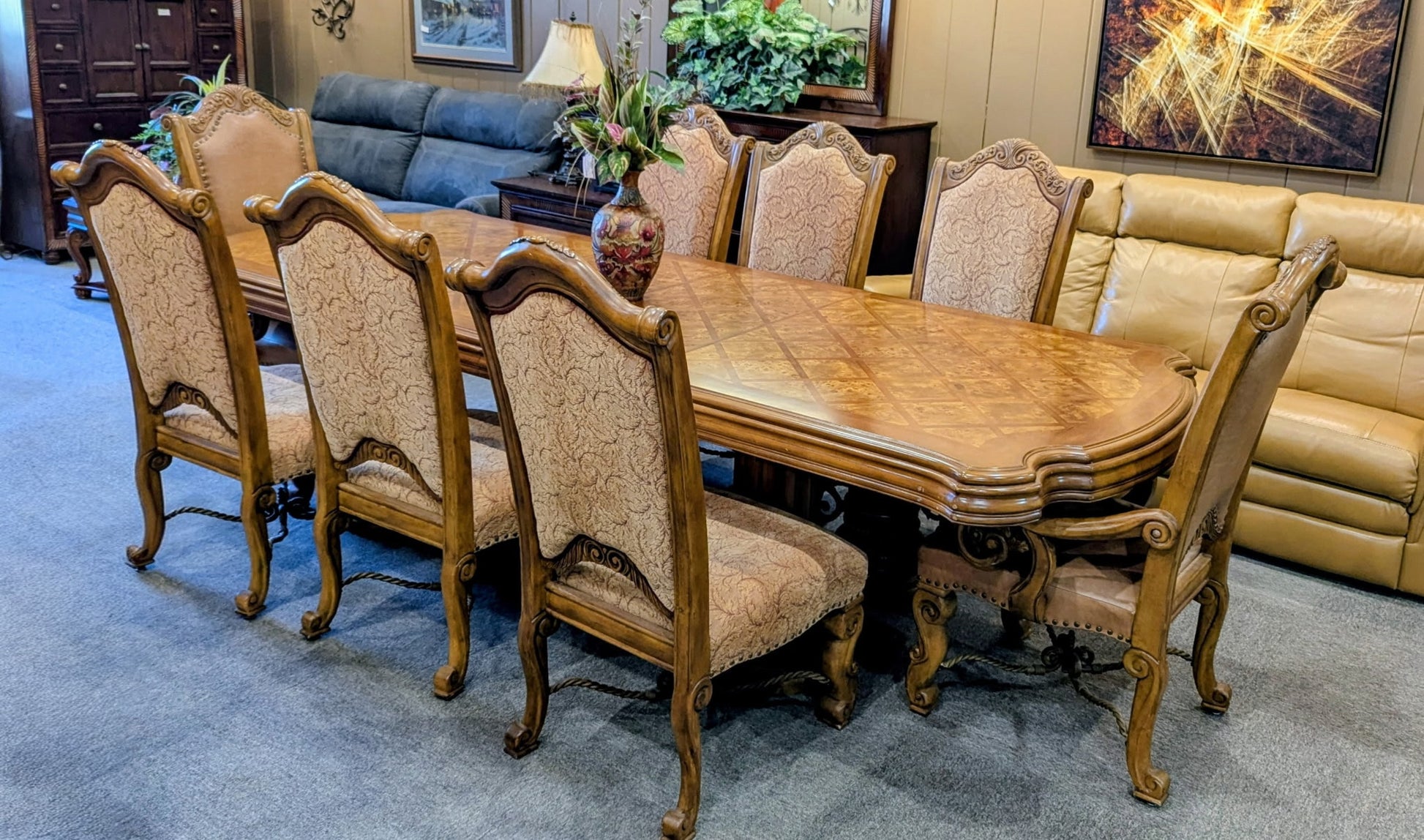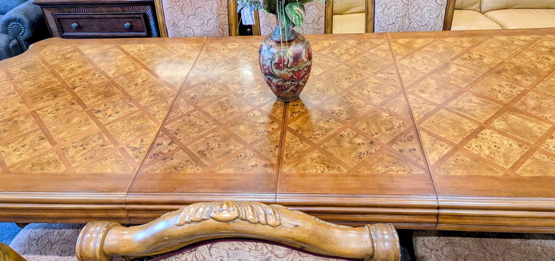 WOOD INLAY DINING TABLE WITH THREE LEAVES AND EIGHT CHAIRS.