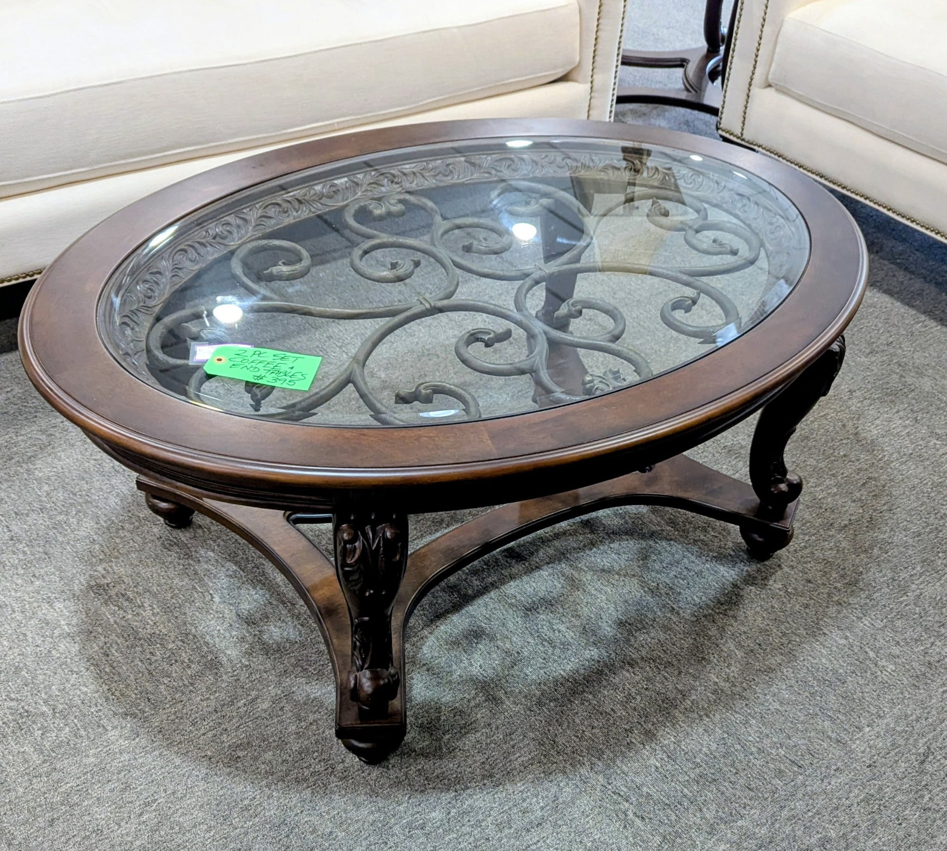 TWO-PIECE SET WOOD OVAL COFFEE TABLE WITH GLASS TOP AND ROUND END TABLE WITH GLASS TOP.