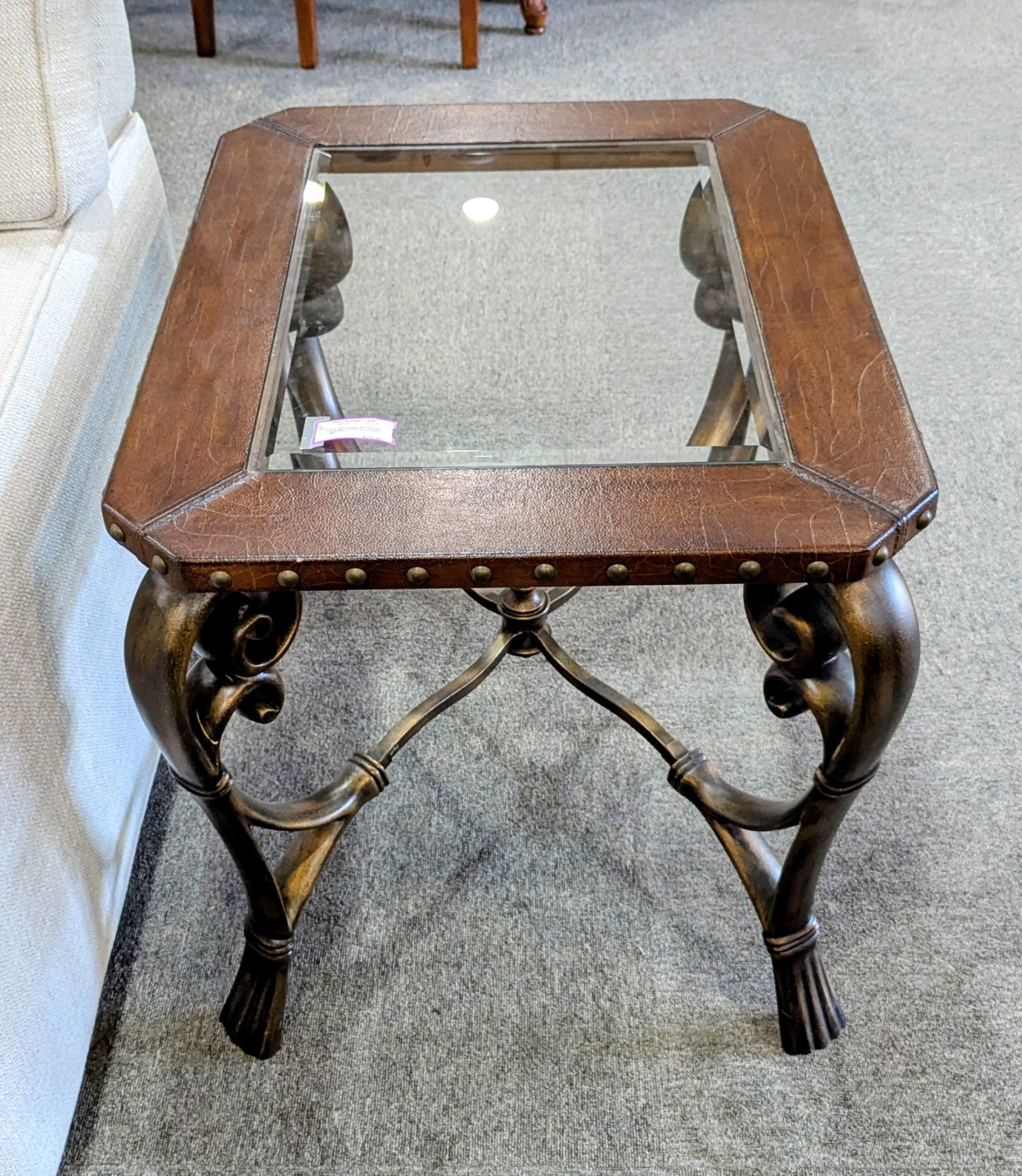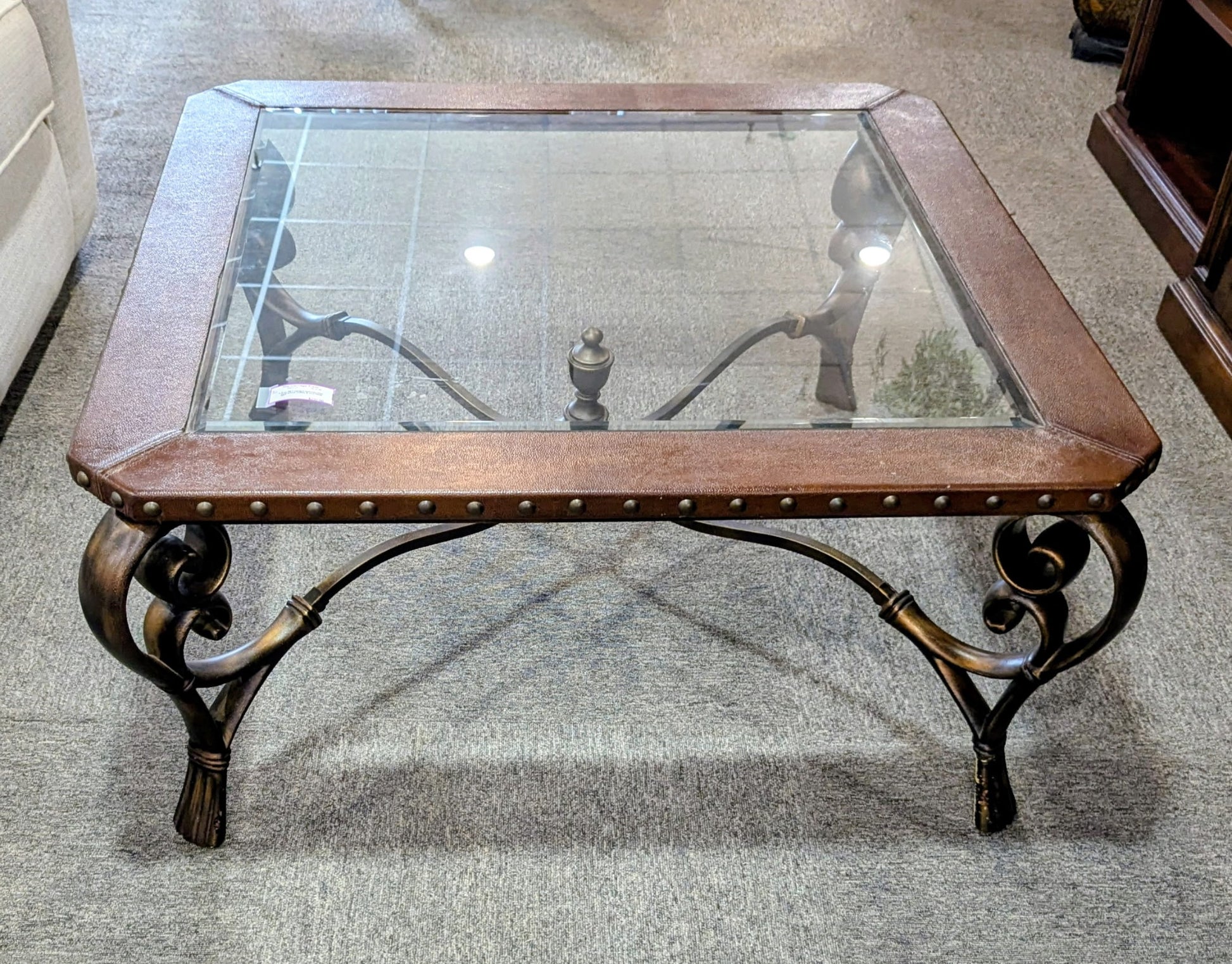 TWO-PIECE SET SQUARE METAL/LEATHER LOOK/GLASS COFFEE AND END TABLE.