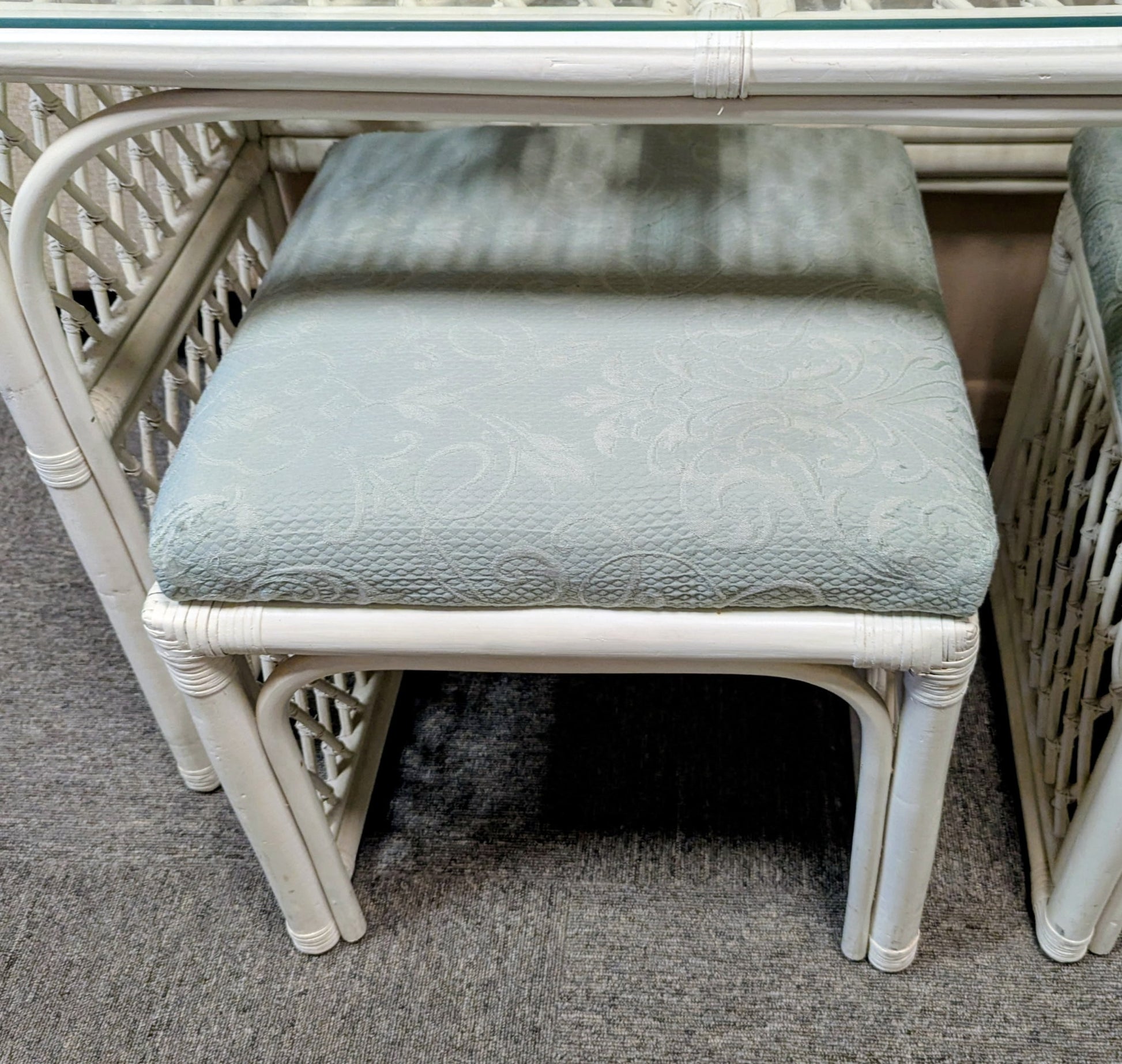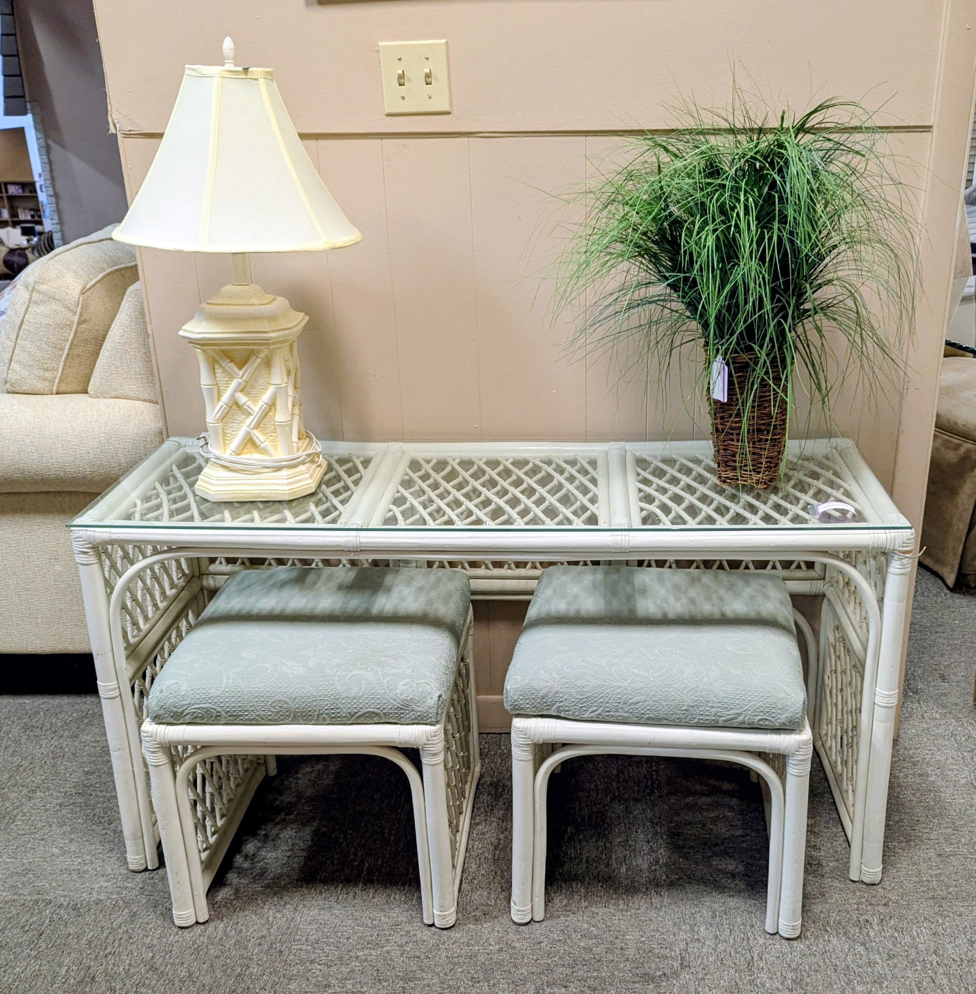VINTAGE RATTAN SOFA TABLE WITH TWO STOOLS. AS IS.