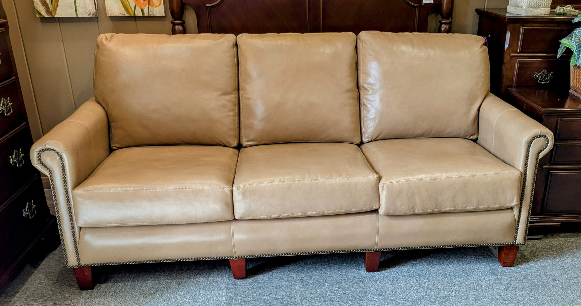 LEATHER CREATIONS TAUPE LEATHER SOFA WITH NAILHEADS.