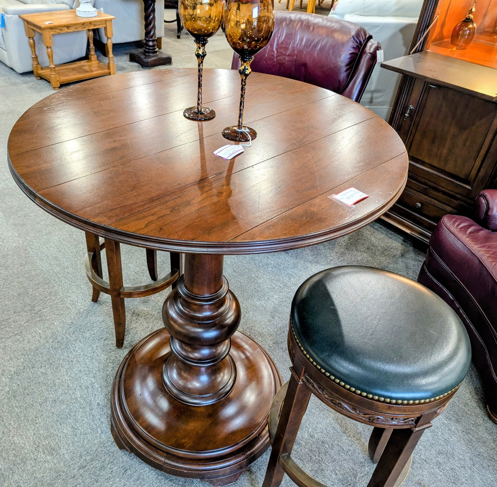 ROUND DARK WOOD PEDESTAL PUB TABLE WITH TWO SWIVEL CHAIRS WITH GREEN LEATHER SEATS